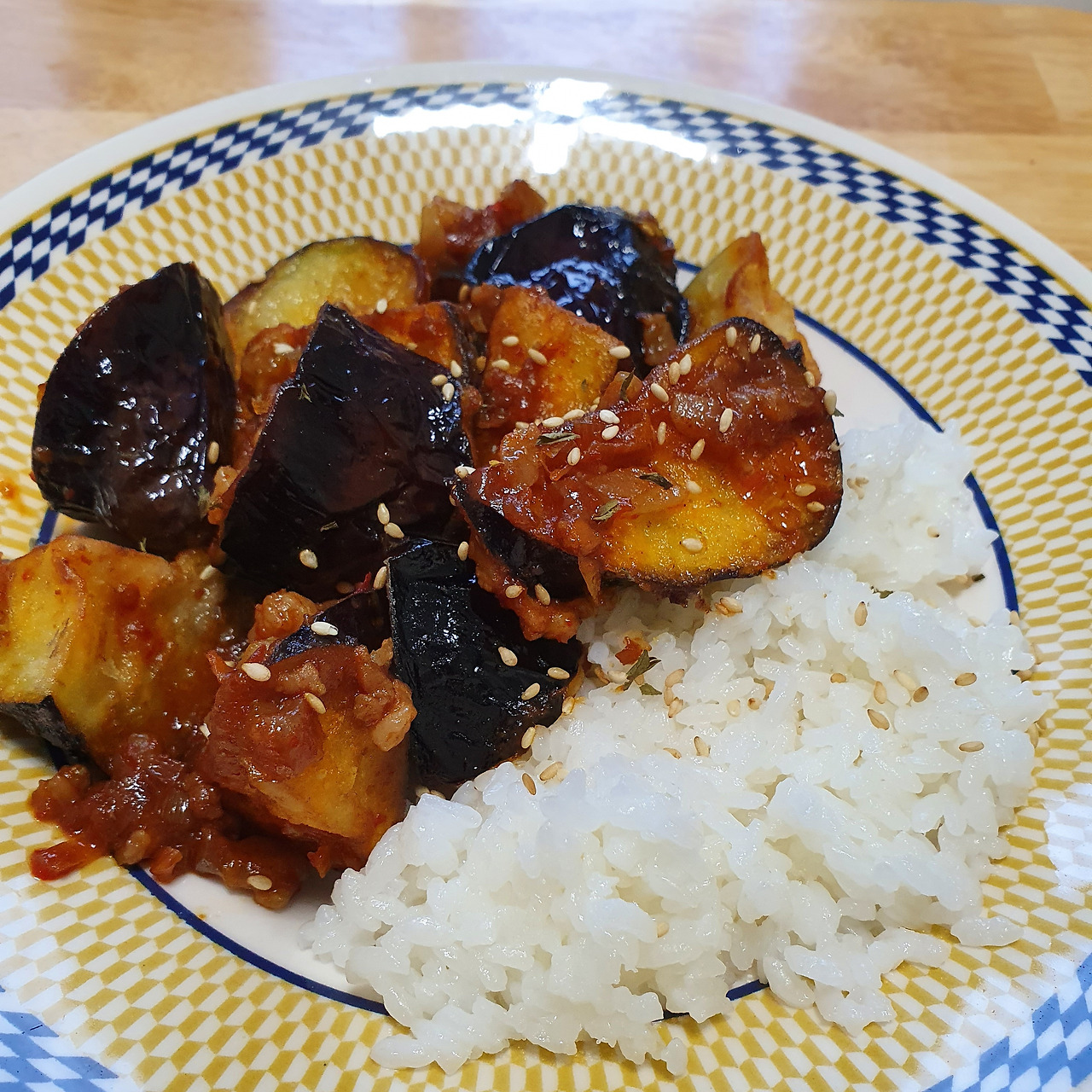 재료: 가지, 밀가루, 전분, 소금, 식용유, 마파소스, 밥