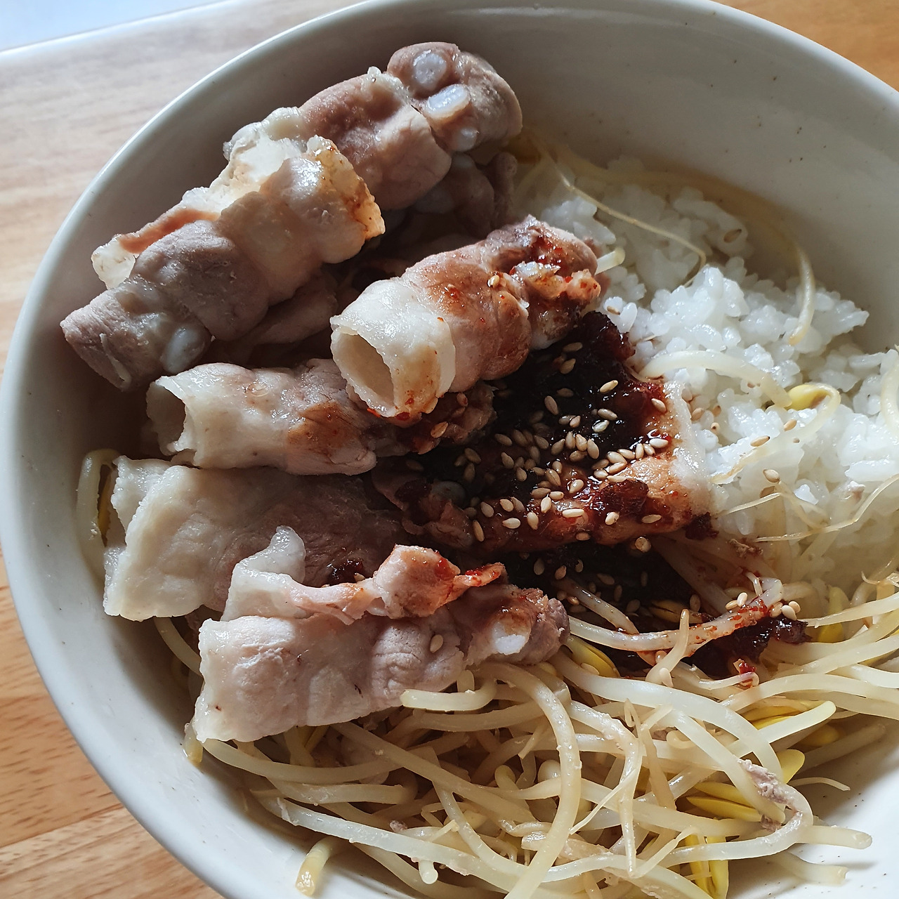 원래는 밥을 짓는 과정에 콩나물을 넣어야 하지만, 냉동된 밥이 이미 너무 많아서 찜기를 택했다. 콩나물과 삼겹살을 찌는데만 오롯이 25분을 투자했다. 1시간 중 25분은 절대 적지 않은 시간이지만,
