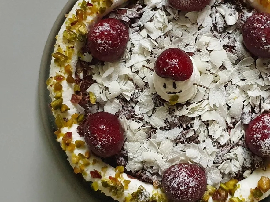 아직 받지 못한 올해의 겨울 첫눈 선물과 함께, 눈 쌓인 블랙포레스트 생일 케이크 완성이다.