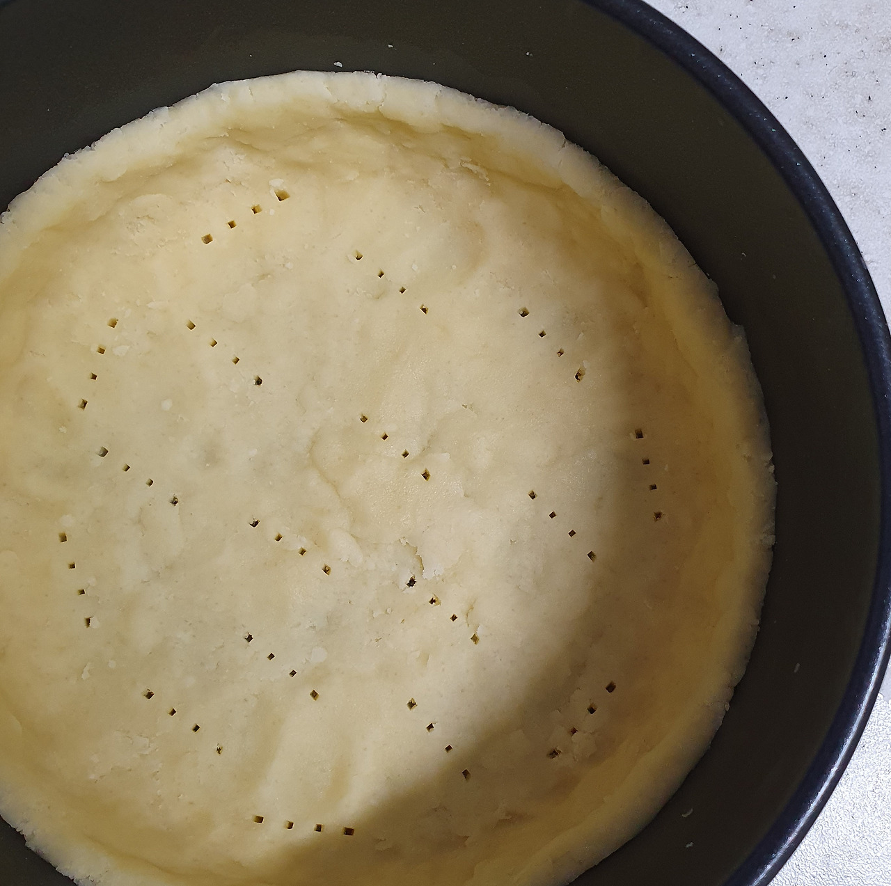 바닥이 부풀지 않게 구멍을 내고 오븐에 넣자. 오래 지나지 않아 달콤한 향을 내며 타르트지가 완성된다.