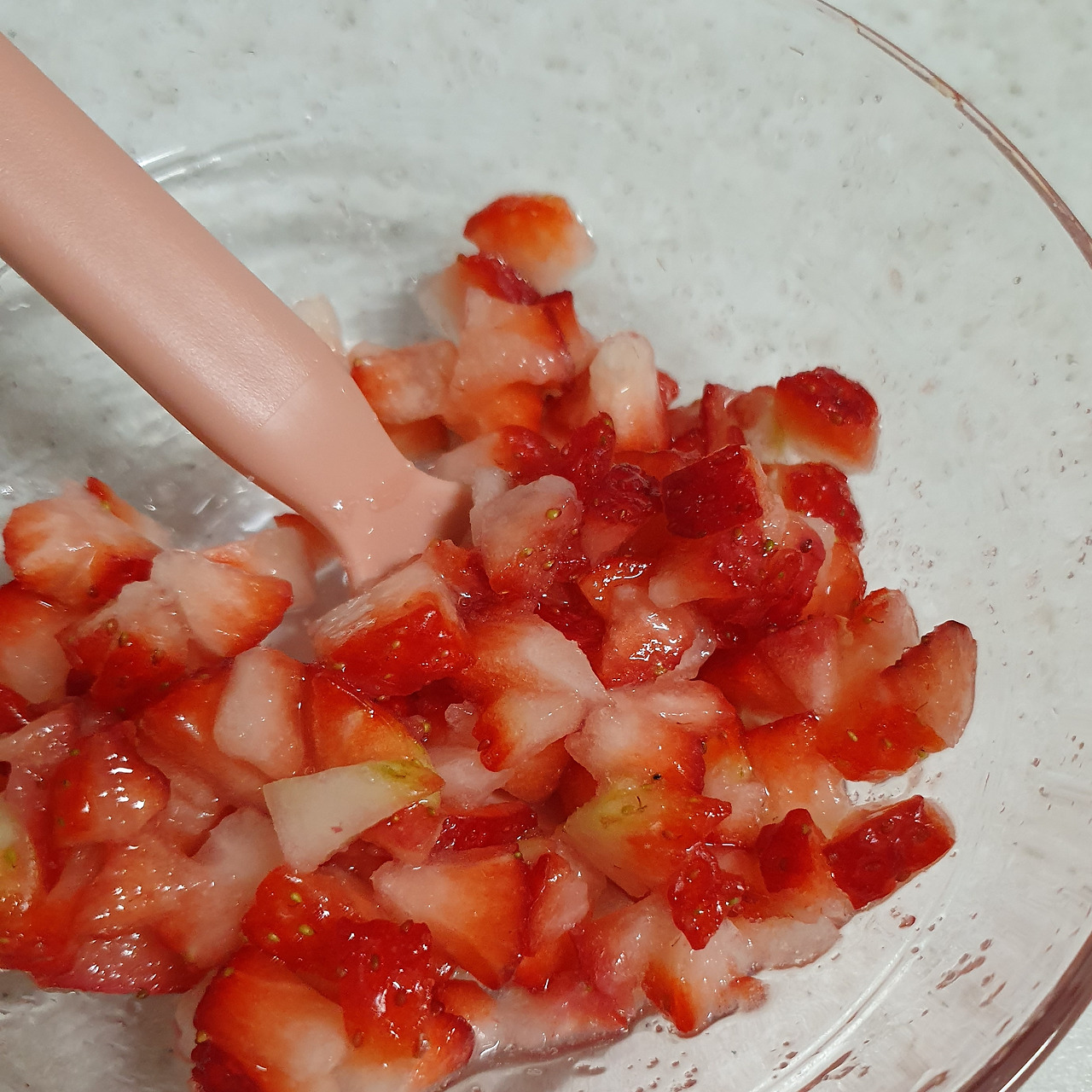 딸기 필링의 설탕은 정말 조금만, 원한다면 생크림에는 색소를 조금 넣어 색을 낸다. 장식용으로 남은 딸기를 마저 자르고 나면 이제 쌓아낼 차례이다.