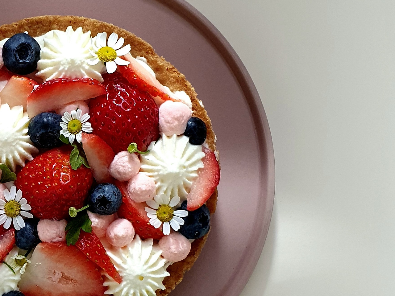 딸기 꽃이 있다면 좋겠지만, 구하기 여간 힘든 게 아닌지라 캐모마일 꽃을 준비했다. 장식용으로 블루베리도 조금 준비했다면, 이제 최선을 다해 예쁜 모양으로 담아내자.