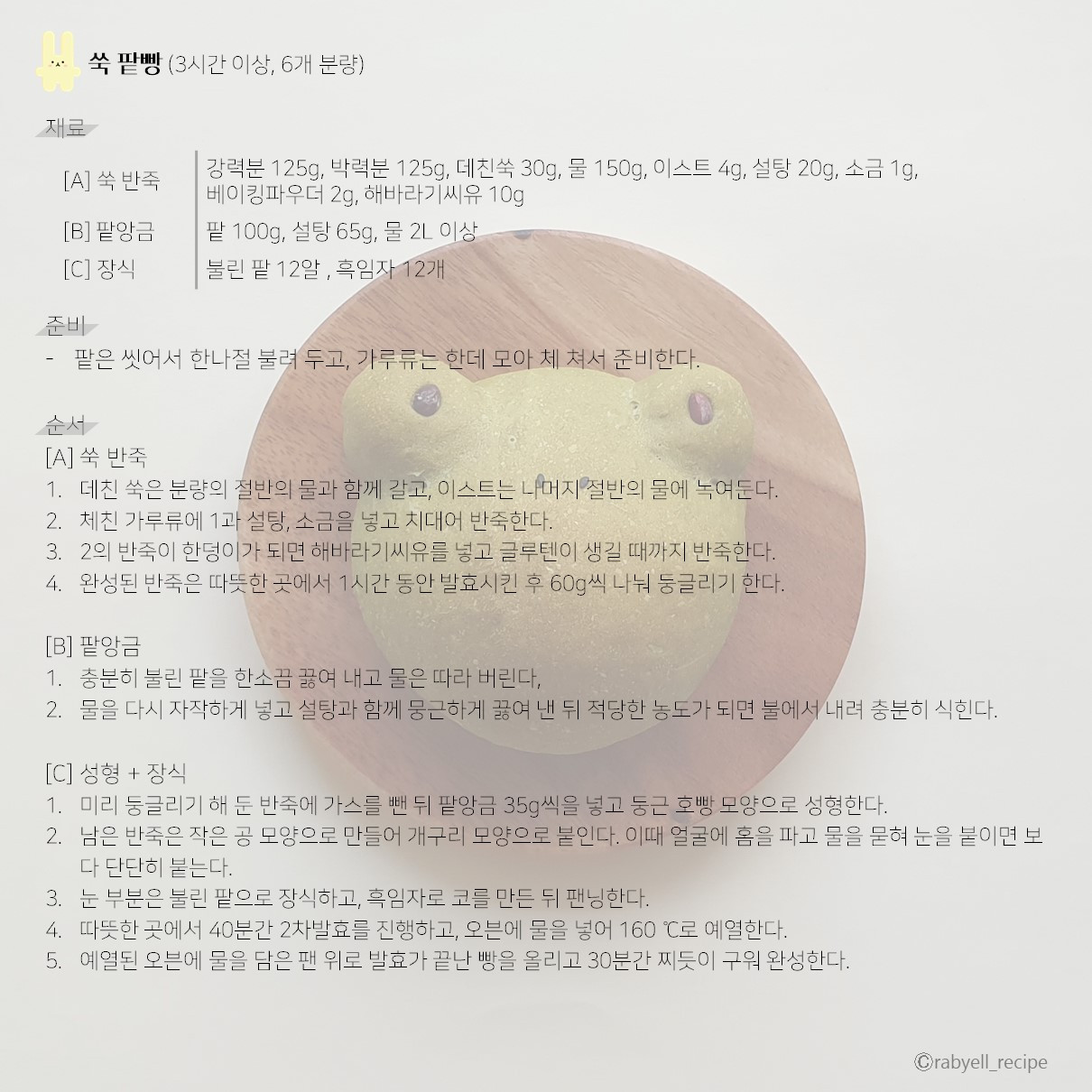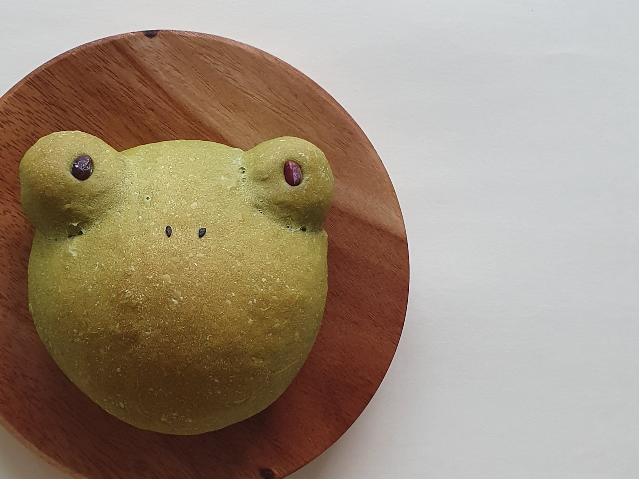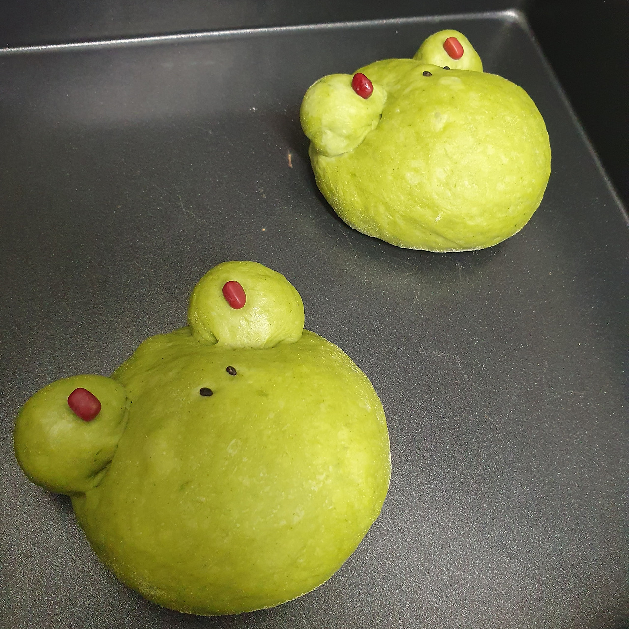 팥과 반죽은 크기에 맞춰 떼어내고, 반죽 가운데에 팥소를 넣어 둥글게 완성한다. 이제 남은 반죽과 재료로 위트를 더한다. 눈과 코를 콕콕 박으면, 짠! 경칩과 어울리는 개구리모양 팥빵이 되었다.