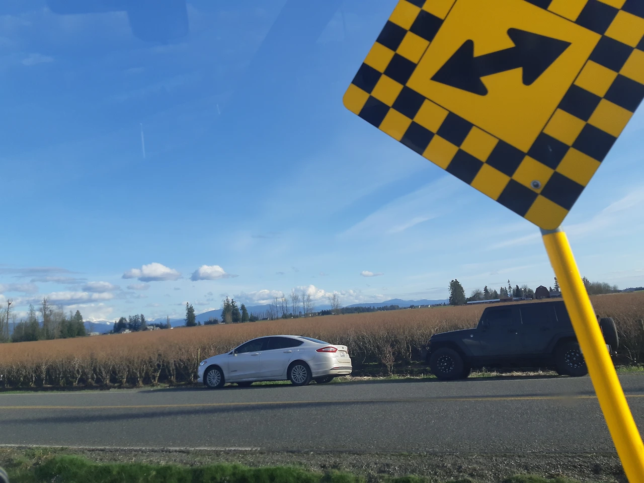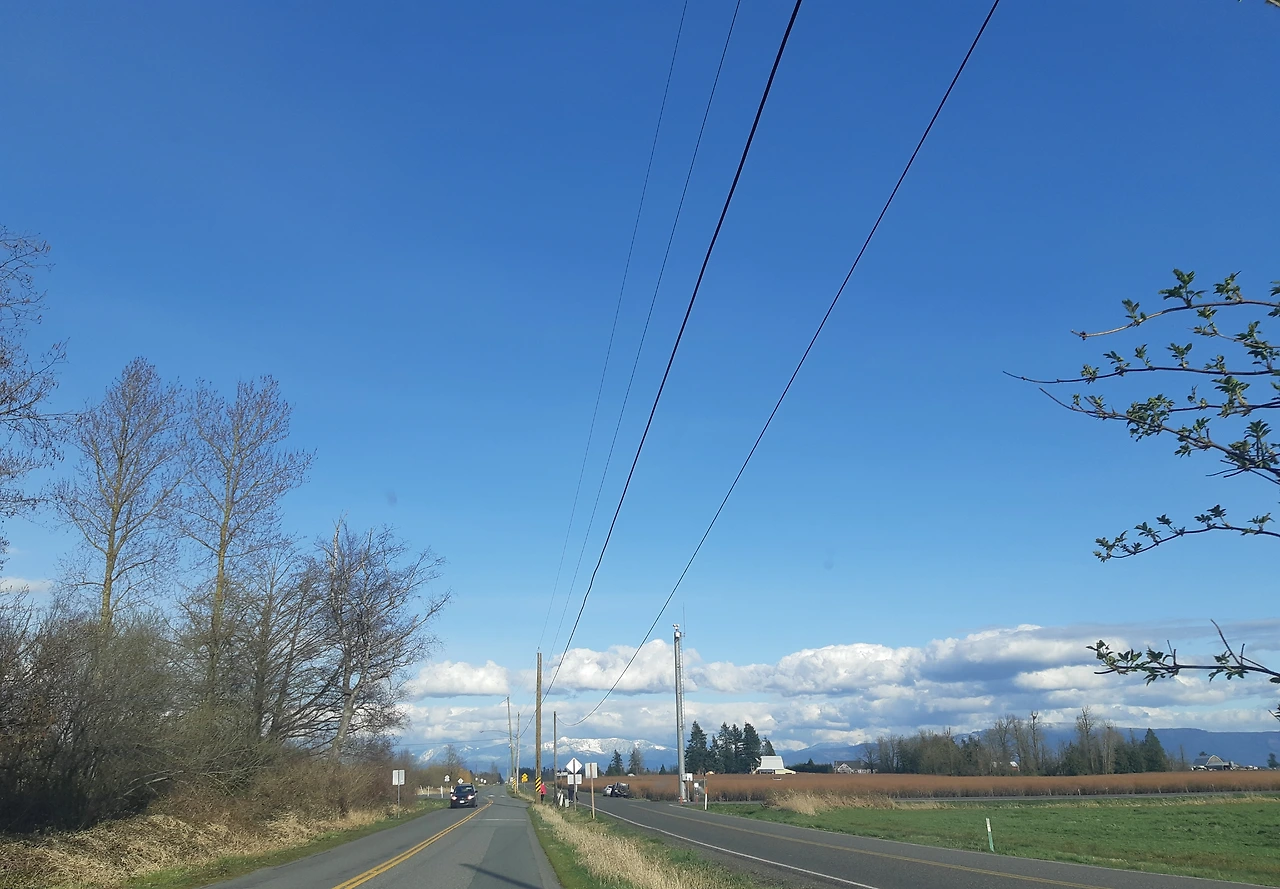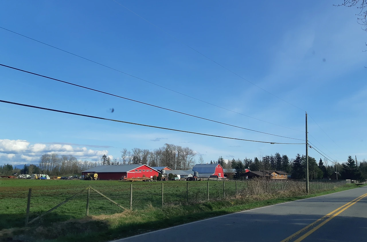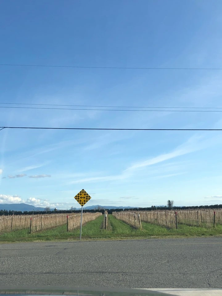 그러나 이상하게 긴장감이 느껴져서 차에서 내려서 사진 한 장 찍을 마음이 들 지 않았다. 멀리는 눈에 덮인 웅장한 산들의 모습, 양쪽으로는 평야에 블루베리, 포도밭 등이 즐비한 풍경에 가슴이 시원해지고 뻥 뚫리는 것 같았다. 이국적인 풍경을 화폭에 옮길 수 있는 재주가 있으면 좋겠다는 생각이 들 때가 많았다. 특별히 빨간색으로 창고 등을 색칠한 경우가 많은데 이 빨간색이 자연스러운 풍경에 맛깔난 포인트가 되는 것 같다.
