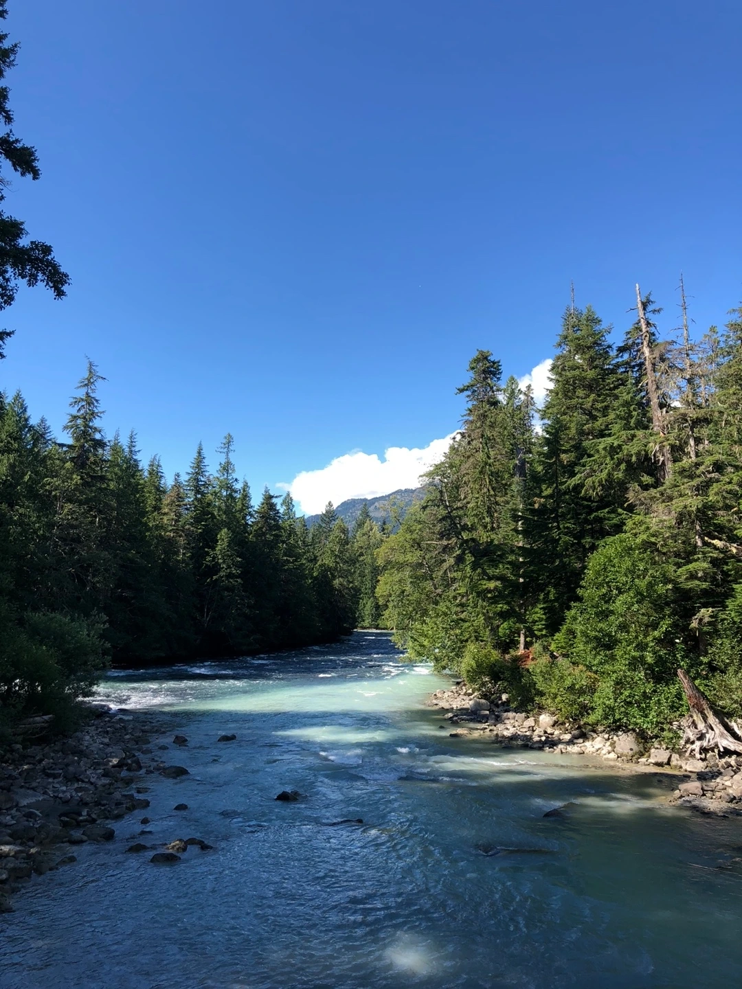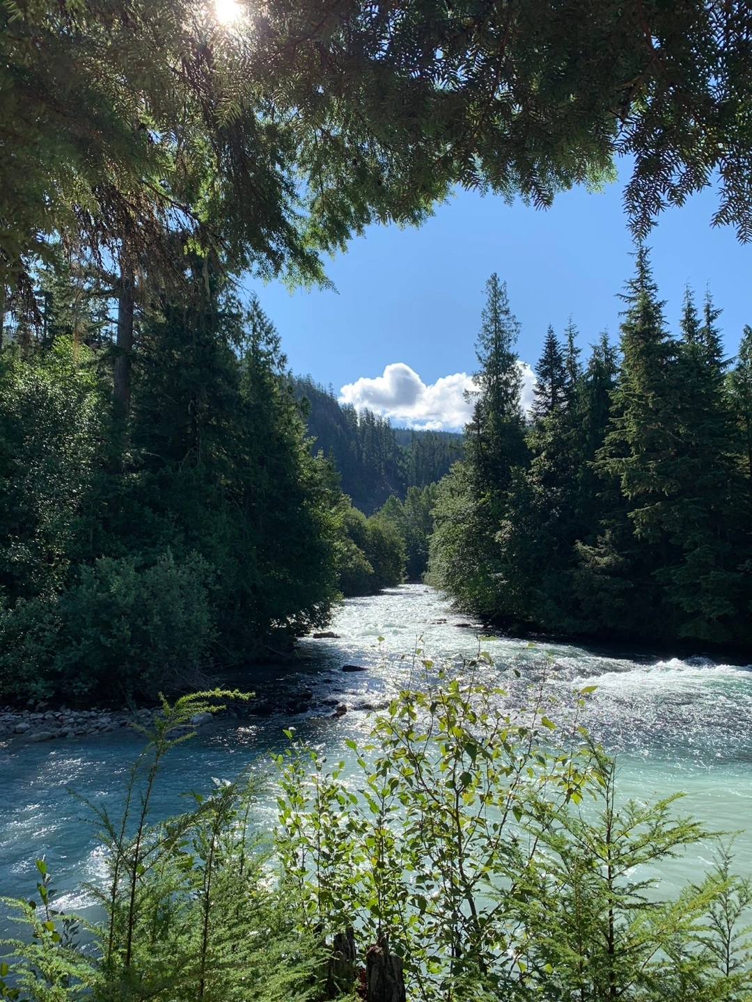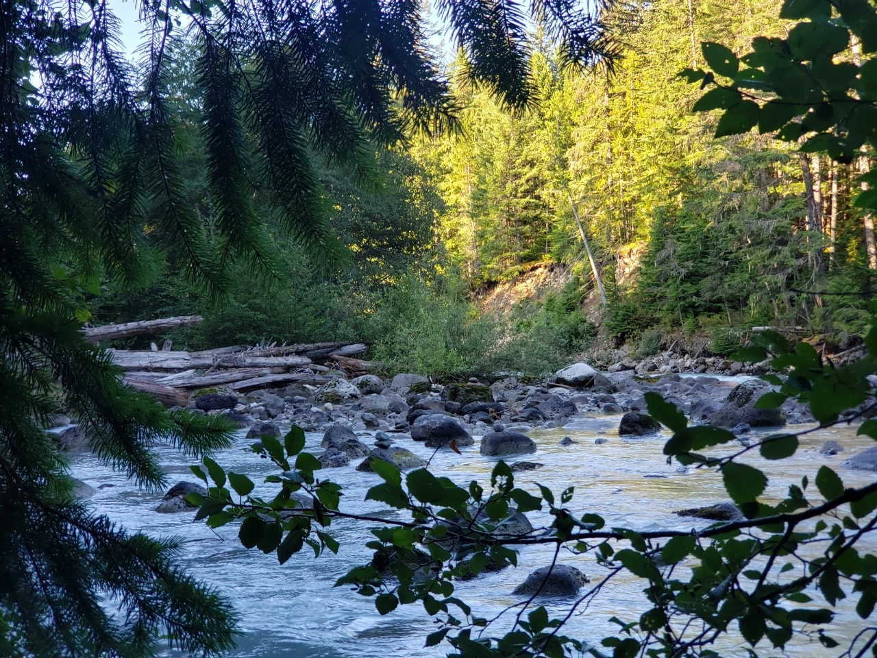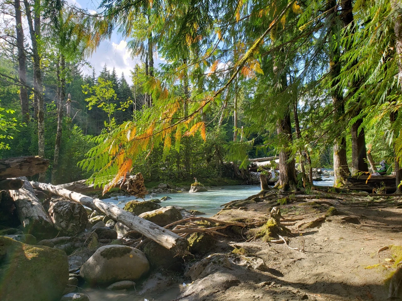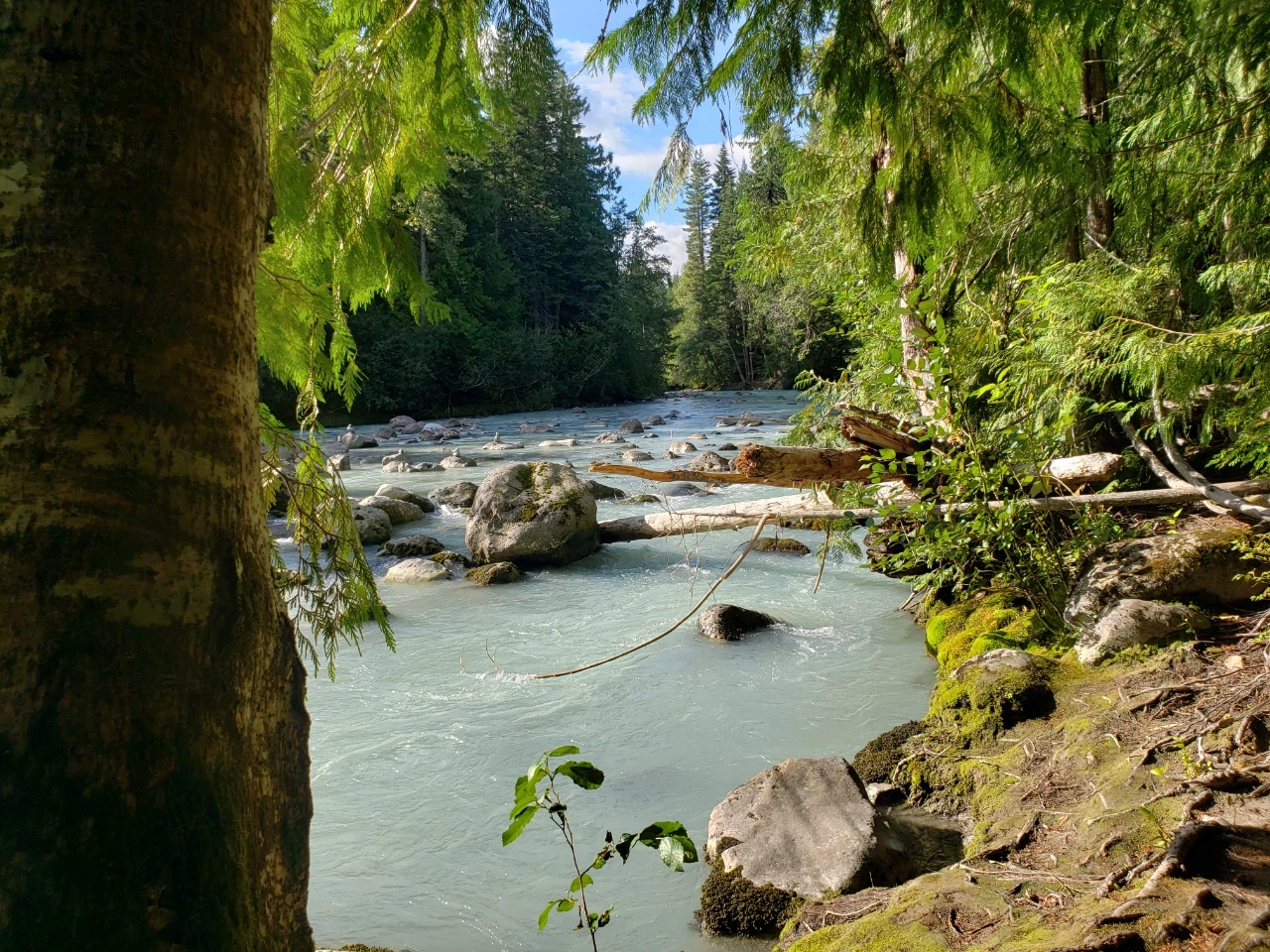 하룻밤 15불을 내는 관리인 없이 운영되는 Calcheak Recreation Site라는 캠핑장이었다. 비용은 알아서 입구 쪽에 설치된 곳에 넣으면 된다. 휘슬러 지역에서는 비싼 돈을 내고 호텔에서만 투숙해야 하는 줄 알았다. 그런데 이렇게 저렴한 비용으로 하룻밤을 지낼 수 있다니 감지덕지였다. 그리고 무엇보다 주변에 있는 Sea to Sky 산책길이 호젓하고 아름다워 탄성이 절로 나왔다. 회색빛이 도는 신비스러운 비취색 강물이 콸콸거리면서 굽이쳐 흐르는 곳이었다. 간간히 우는지 웃는지 모르겠는 숲새들의 소리가 들려왔다. 한도 없이 쏟아져 내려오는 물가에서 책을 읽거나 누워 자는 가족들의 사진을 찍으며 시간을 보냈다.