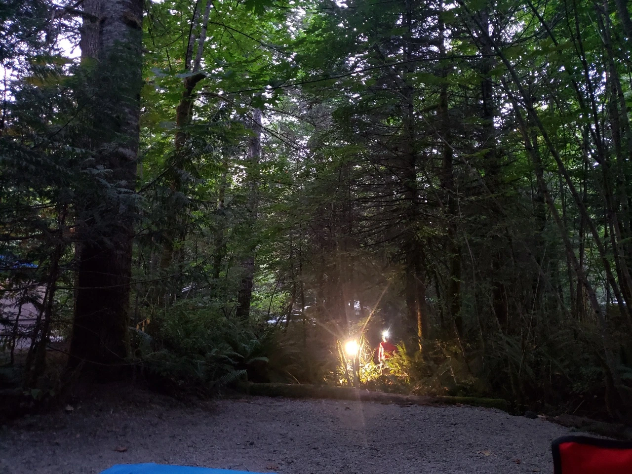 파라다이스의 밤이 되자 아이들의 목소리가 숲 여기저기에서 들렸다. 아이들이 머리에 단 랜턴이 숲 여기저기 비추는데 꼭 반딧불이 날아다니는 것 같았다. 프로판 가스를 모닥불처럼 피워놓고 두런두런 정겹게 이야기는 나누는 가족들의 모습이 붉은 불빛에 어른 거렸다. 캠핑장의 식구들은 각기 다른 개성대로 밤을 보내고 있었다. 바로 옆은 루프탑 텐트에서 편안하게 잠을 청하고 갔다. 기타 캠핑카와 텐트족도 많았다. 캠핑하는 식구들도 식구들이지만 늦은 저녁 어두운 가운데에서도 푸른빛 하늘을 배경으로 숲이 살랑살랑 몸을 흔드는 게 재미있어 그저 바라만 보는데 실실 웃음이 나왔다.