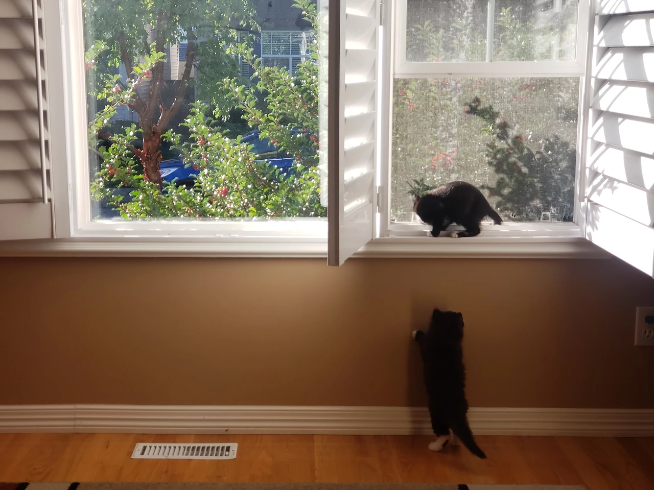 나비는 걷는 폼도 살랑살랑 날아다니는 것처럼 우아하다. 매력적인 존재라는 티가 난다. 이 집 누구도 내려다볼 수 있을 만큼 당당한 투다. 마치 장화를 신은 듯한 뒷다리까지 귀엽다. 당연하듯 스타가 되어 가고 있다.