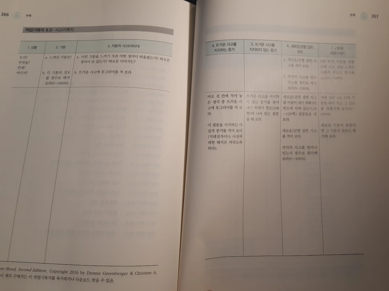 나의 경우도 어릴 때에는 왕성한 에너지가 있어 그런 것들을 바라볼 만큼의 여유가 없었다. 그저 앞으로 나가기만 하면 될 것 같았으니까. 그리고 재미있는 것들에 대한 호기심이 그런 시간들을 다소 만회할 수 있게 해 주었다. 그러나 언젠가부터 새벽녘이면 잠을 일찍 깨서 불안해하는 나를 발견할 수 있었다. 그러고 보니 낮에도 부정적인 생각을 자주 하고 있었다. 그저 그렇게 그 불안이 나를 잠식하도록 두지는 않겠다는 생각이 들면서 내가 얼마나 자주 부정적인 생각을 하는지 관찰하기 시작했다. 그리고 그 생각으로 어떠한 영향을 받고 있는지 작업 기록지들을 이용해서 평가해보기 시작했다. 그리고 실제로 한 장 한 장 평가를 하면서 나를 객관적으로 들여다보며 내 생각들이 합리적이지 못한 부분이 많았기에 기분, 신체, 활동에 까지 영향을 끼쳤다는 것을 알 수 있었다.