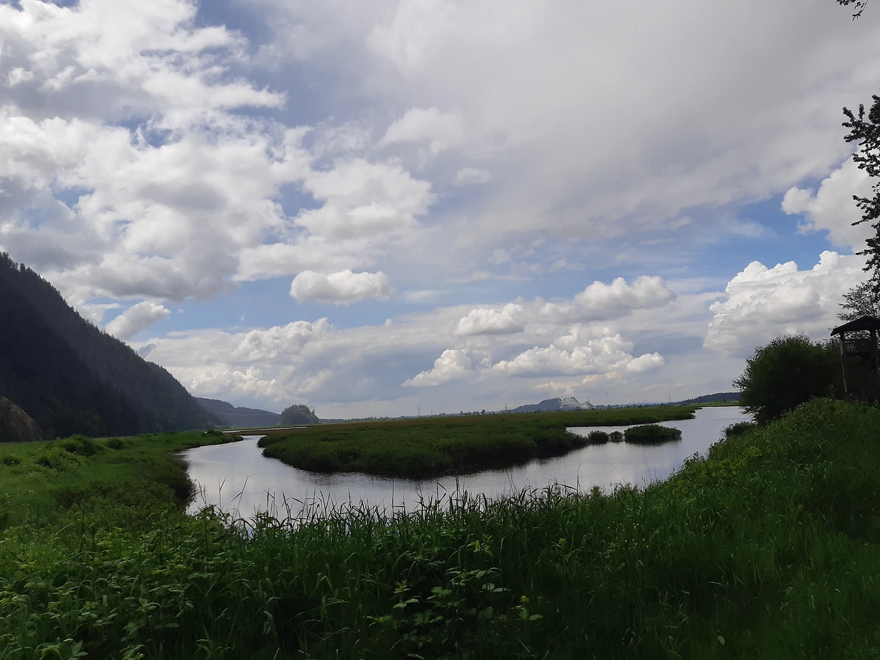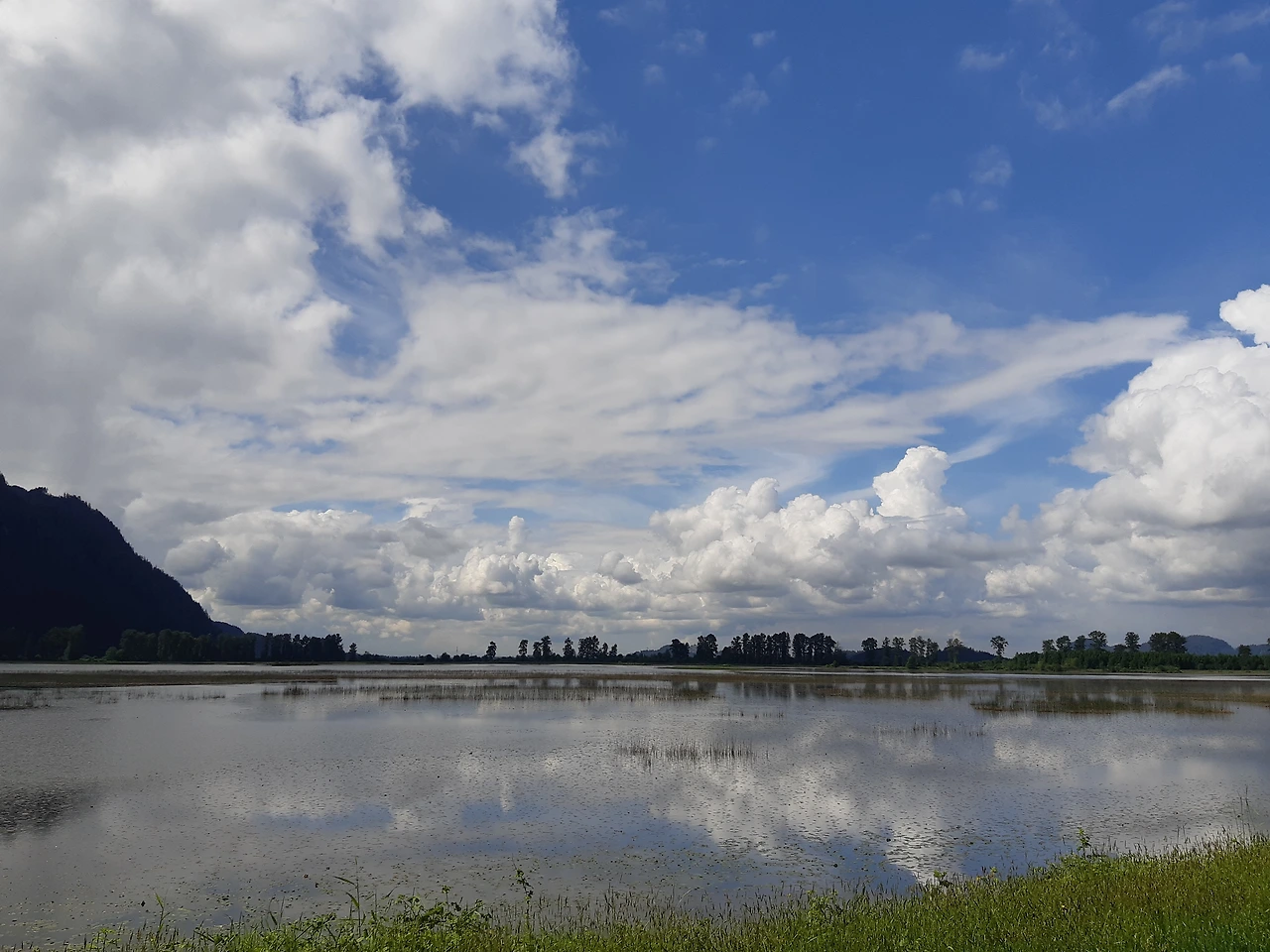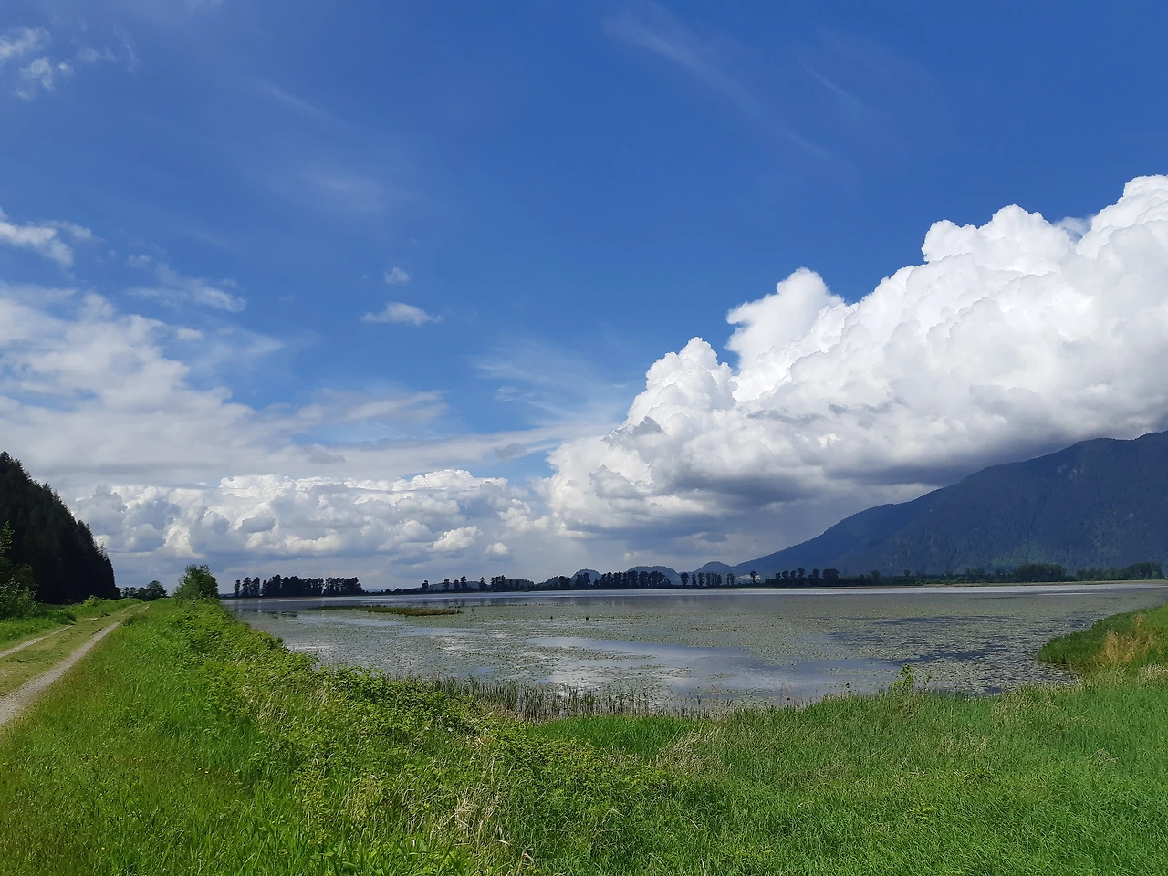 왼쪽은 맑은 호수이고, 오른쪽은 각종 수초가 잠겨 있어 탁하게 보인다. 신비스럽게도 양쪽 호수 모두 푸른 하늘과 흰 구름의 나르시시스트적인 얼굴을 담가 두고 있다. 왼쪽 호수 오른쪽 호수를 번갈아 바라보면서 걷는데 윤슬이 보석을 깔아놓은 듯 반짝이고 있었다. 마치 꿈결에 있는 것처럼 느껴졌다. 둑길은 흙길이었다.. 오랜만에 밟아보는 흙, 어릴 적 흙먼지를 날리며 달려보던 그 느낌이 생각나 반가웠다. 그래서 이곳에 오면 한국 생각이 났던 모양이다.