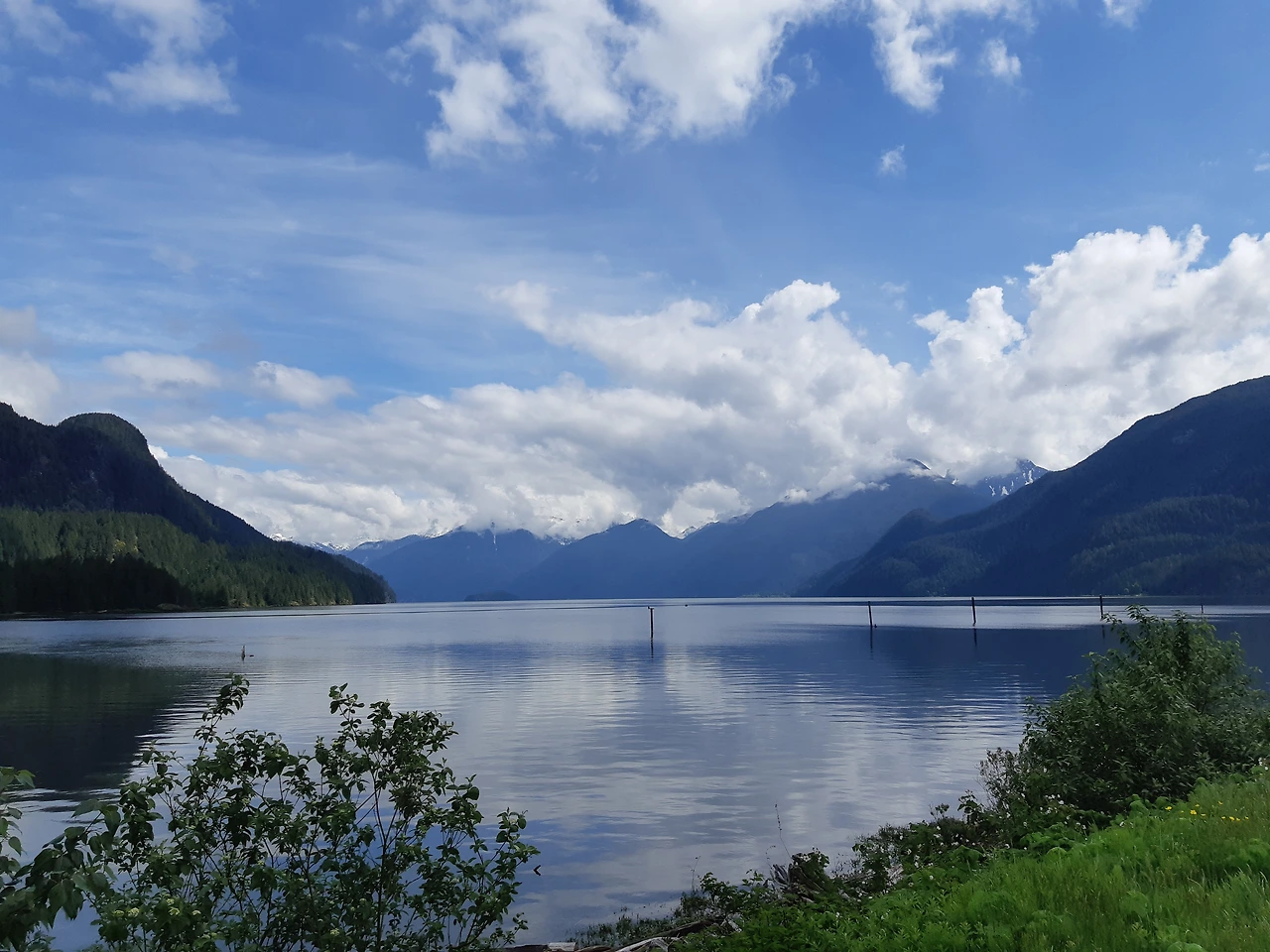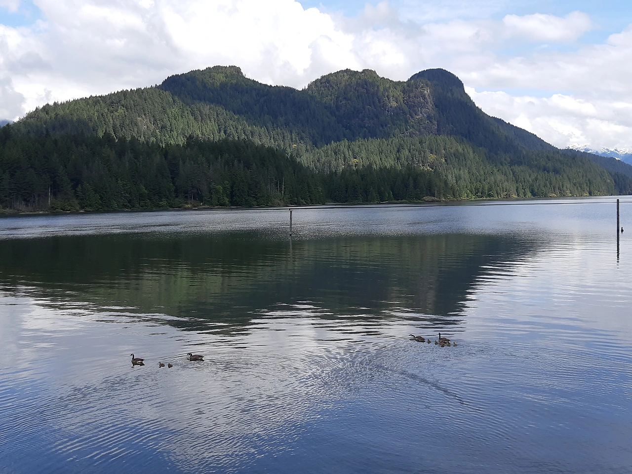 호수 뒤편의 눈을 품은 산에서 불어오는 바람 냄새에서 아직도 겨울이 느껴진다. 둑길은 분명하게 끝이 보이는 길이라 좋았다. 왼쪽에 위치한 맑은 호수 위에 올망졸망한 새끼들을 데리고 가는 캐나다 구스 두 쌍이 보인다. 한쪽은 일곱 마리 새끼를, 다른 한쪽은 세 마리의 새끼를 품은 모양이다. 일곱 마리의 새끼 가운데 한 마리가 무리에서 벗어나더니 다른 가족에게로 다가간다. 어미 독수리 한 마리가 날개를 퍼덕이며 새끼에게 먹이를 물어다 주는 모습도 보인다. 그들의 모습을 정신을 놓고 바라보았다. 침엽수림이 빽빽한 산과 흰 구름이 마치 데칼코마니처럼 호수 속에도 풍덩 빠져 있었다.