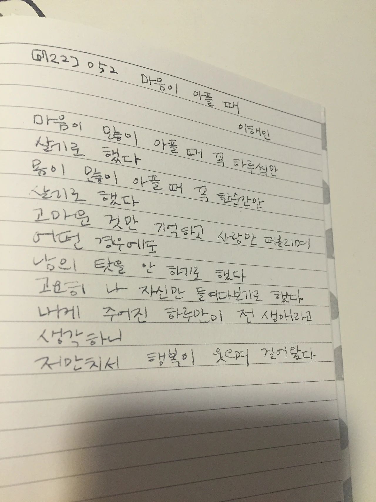 마음이 아플 때 - 이해인마음이 많이 아플 때 꼭 하루씩만 살기로 했다.몸이 많이 아플 때 꼭 한순간만 살기로 했다.고마운 것만 기억하고 사랑한 일만 떠올리며 어떤 경우에도 남의 탓을 안 하기로 했다.고요히 나 자신만 들여다보기로 했다.내게 주어진 하루만이 전 생애라고 생각하니 저만치서 행복이 웃으며 걸어왔다