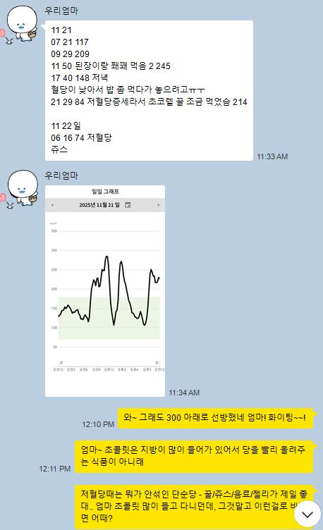 엄마가 혼자 있을 땐, 특히 저혈당이 온 다음이 무섭다. 내가 경험해보지 못한 저혈당 쇼크, 정말 죽을 것 같은 느낌이라고 한다. 그래서 알면서도 계속 혈당을 높이는 음식을 먹게 된다고. 엄마와 내가 같이 있을 땐, 옆에서 '엄마, 이미 당 15g 정도 먹었으니까 15분만 지나면 혈당이 오를 거야. 더 먹기 전에 15분만 기다려보자. 혈당은 내가 계속 보고 있을게' 이렇게 엄마 손을 잡고 조절하는데, 엄마가 혼자 있을 땐 특히나 이 과정이 힘들 것 같다.