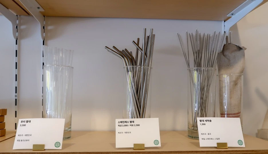 스테인리스, 유리, 쌀 재질의 빨대와 다회용 포장재, 천 가방을 판다.