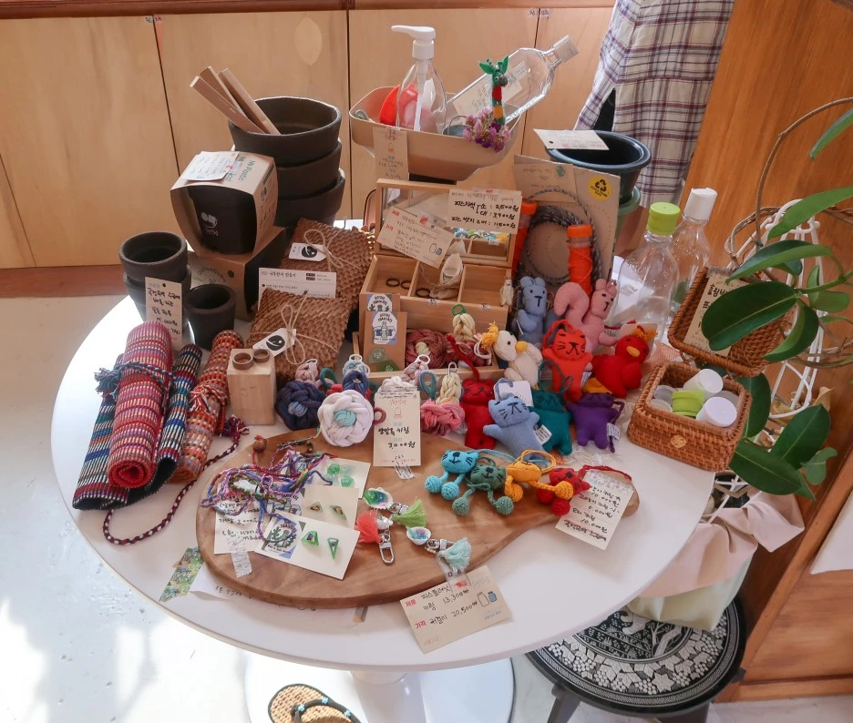 페트병, 우유팩, 커피가루, 병뚜껑 등 재활용품을 알맹에 갖다 주면 알맹상점에서 분류해 모아 뒀다가 재활용품이 필요한 업체로 보낸다. 그럼 또 다른 업사이클링 제품으로 재탄생한다.
