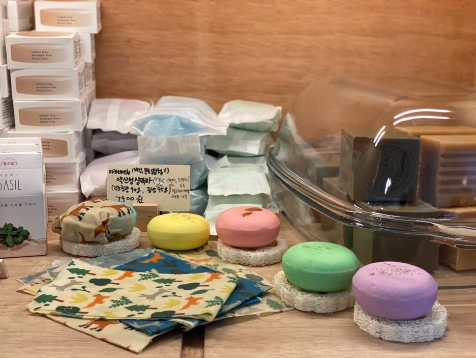 매장 곳곳에는 비닐 대신 사용할 수 있는 보자기, 천연 소재로 만든 삼베 수세미, 스테인리스/유리 빨대와 같은 다양한 친환경 제품들도 판매하고 있다.