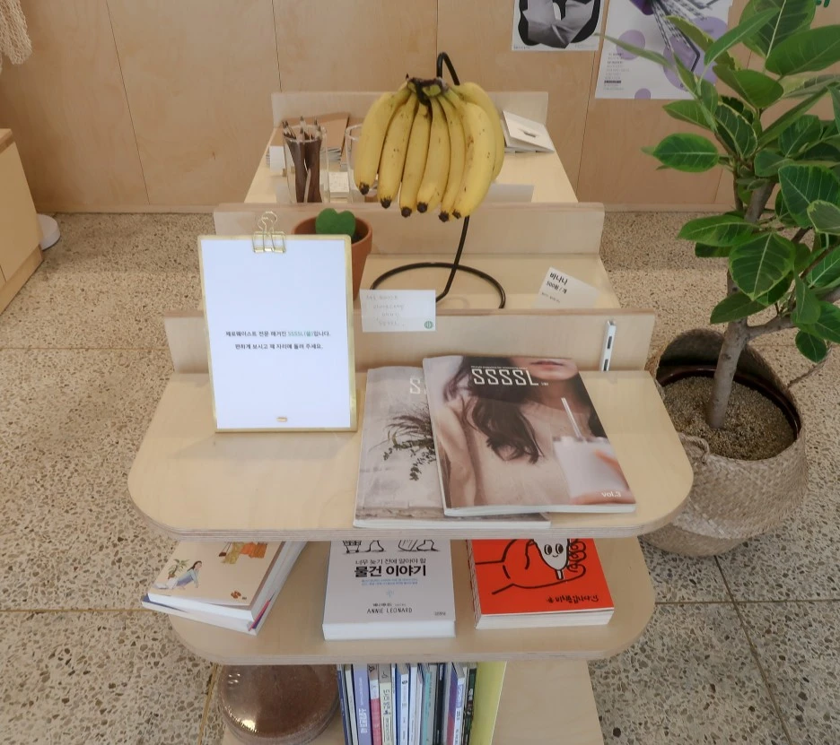 음료 메뉴도 다양한 편이다. 지구에 좋다고 맛이 없거나 재미가 없는 건 절대 아니다. 커피부터 시작해서 탄산수로 만든 자몽 에이드, 히비스커스 티, 사과요거트 등이 있었다. 버터, 계란, 우유가 들어가지 않은 비건 쿠키와 직접 만든 마들렌, 휘낭시에, 초코쿠키도 있다. 스테인리스 빨대, 유리 빨대 외에도 생리 컵, 순면 생리대 등을 구매할 수 있다.