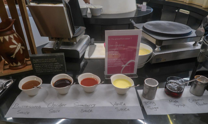가장 일반적인 호텔 조식의 종류로 취향에 따라 마음껏 골라먹을 수 있는 뷔페형이다. 늘 조식은 베이커리류와 과일을 먼저 고르는 편인데 이런 메뉴에 질렸던 차에 된장국이 있어 반가웠다. 웨스턴과 아시안 음식이 비슷한 비율로 있고, 사진에 다 담을 수 없을 만큼 종류가 다양하다. SPG 계열사인만큼 베이커리류가 역시 맛있는데 즉석에서 만들어주는 크레페에 아이스크림을 올릴 수도 있다.