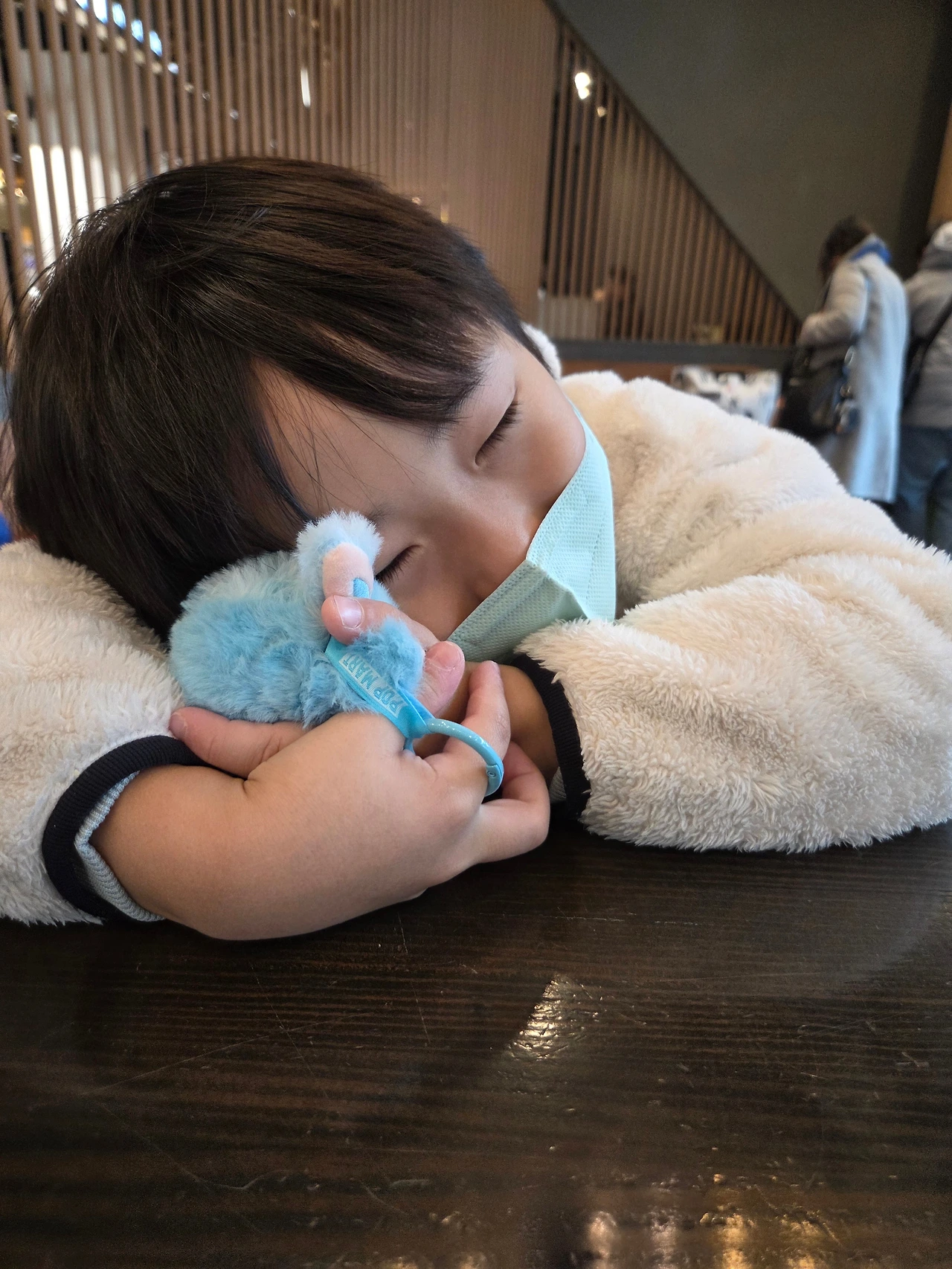 파란 라부부 인형을 품에 안은 아이는