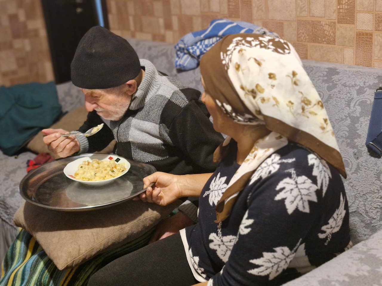 오늘도 역시 '차이 올라르'를 말했다. 아주머니 한분이 문을 열며 집으로 들어오라고 하신다. 비가 와서 질퍽한 땅을 밟으며 걷는 우리에게 손짓을 하신다. 넓은 마당에 사과나무에서 떨어져 있는 작은 사과들을 지나 집 안으로 들어갔다. 조금은 선선한 날씨에 난로에서 나오는 따뜻한 열기가 너무 반가웠다. 차와 손수 만드신 빵을 대접하시는 모습에 거듭 인사를 하며 한국에서 온 우리를 소개했다. 거실 소파에는 나이가 많으신 할아버지 한 분이 누워계셨다. 많이 노세한 모습이 이제는 눈도 보이지 않으신다고 했다. 나이가 96세인 시아버지를 모시며 집안일을 하시는 이 아주머니는 이곳 평범한 아제르바이잔 여인의 모습인 듯했다.