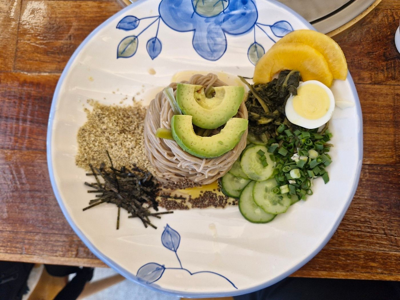 그렇게 걷다 눈에 팔당 메밀국수라는 단어가 띄었다. 화려하지 않지만 구수한 냄새가 나는 메밀국수가 팔당역과 닮아 있을 것 같았다. 이른 점심을 먹으러 식당 안으로 들어갔다. 한 주먹의 메밀국수와 들깨, 곁들여진 시래기와 얇은 오이 그리고 아보카도와 단감의 식감이 잘 어울렸다. 눈에 띄지는 않지만 주변을 채우는 든든한 친구처럼 내 입안에서 채워지는 메밀국수의 맛은 나의 위를 편안하게 채워주었다. 조금 먹어도 포만감이 느껴지고 강렬한 양념이 아니지만 그 편안한 맛에 더욱 편해졌다.