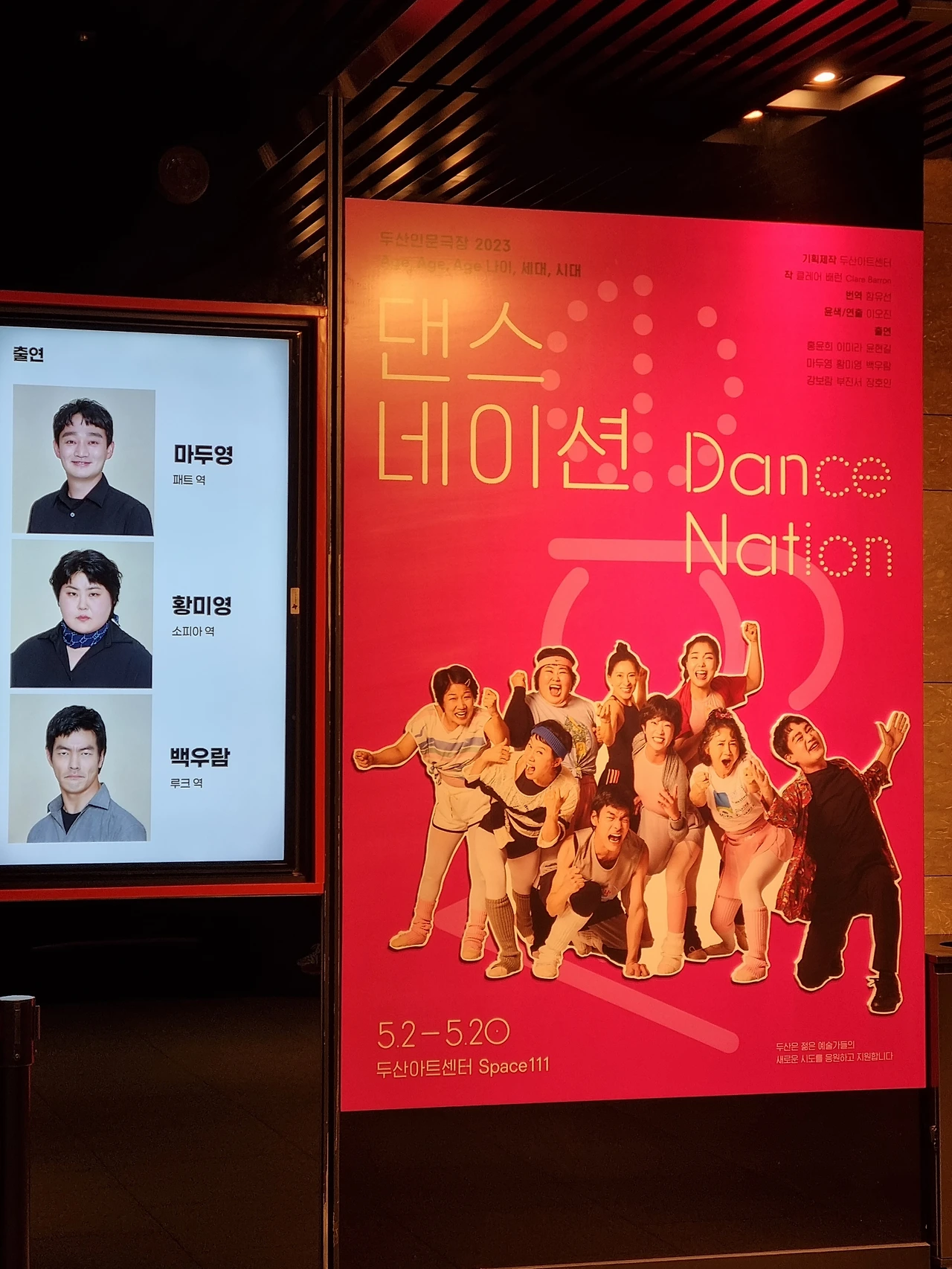 무대 한가운데 그리고 왼편 상단에 한글 자막이 지원된다. 대사뿐만 아니라 무대, 조명, 음악의 분위기, 음량 세기 등등 구체적인 설명이 더해져 장애를 가진 관객들이 공연 관람하는 데에 불편함을 덜 수 있도록 한다. 나도 간혹 잘 들리지 않는 긴 대사를 자막을 보면서 확실하게 이해하고 인지할 수 있었다. 극 중에서 소리를 지르는 장면이 있었는데 이때 자막 속 글자 크기가 점점 커지게끔 해, 텍스트로도 소리의 변화를 느낄 수 있게 한 부분이 기억에 남는다.