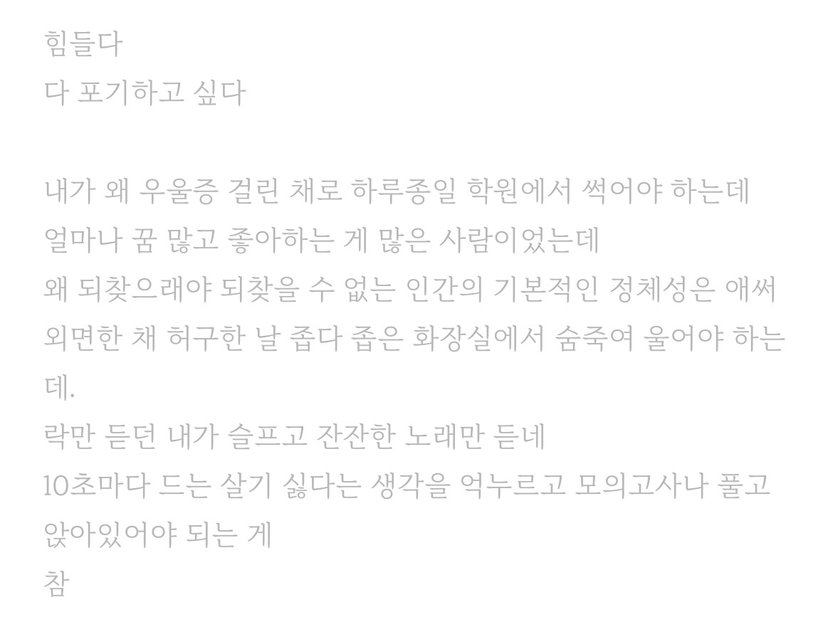 우울감이란 마치 심장을 짓눌리고 으깨어져 믹서기에 갈리는 동시에, 큰 운석이 위에서 나를 누르고 있는 것 과 같다. 힘이 없는 게 아닌데 걷는 것도, 양치하는 것도 버겁다.