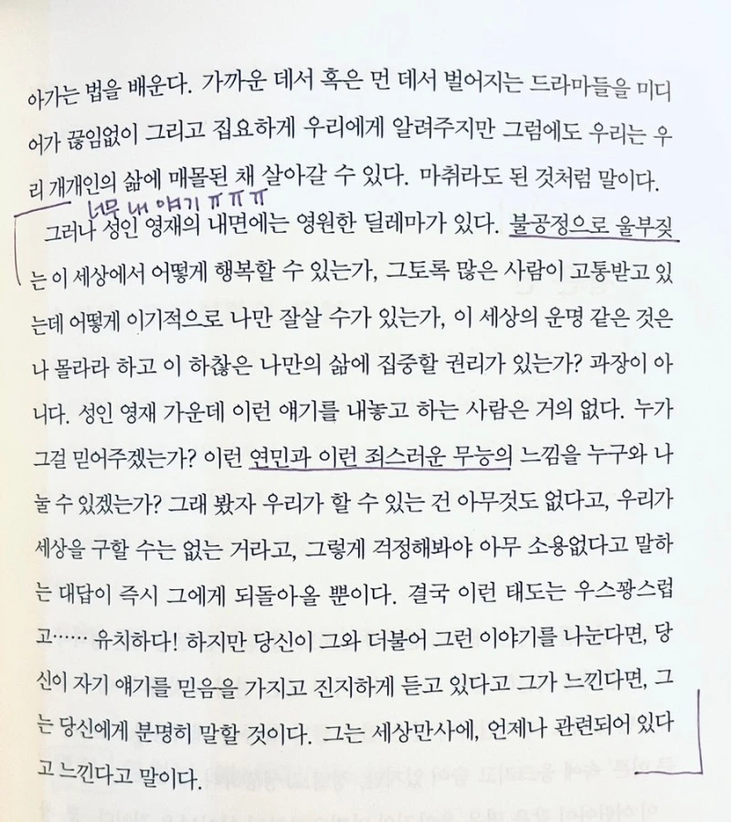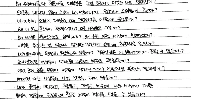 공책 세 면을 꽉 채운 철학적인 질문들을 보여드렸다. 간절히 내가 정상이길 바라면서. 원래 다 그러는 거 아니냐는 선생님의 답변 아닌 답변.