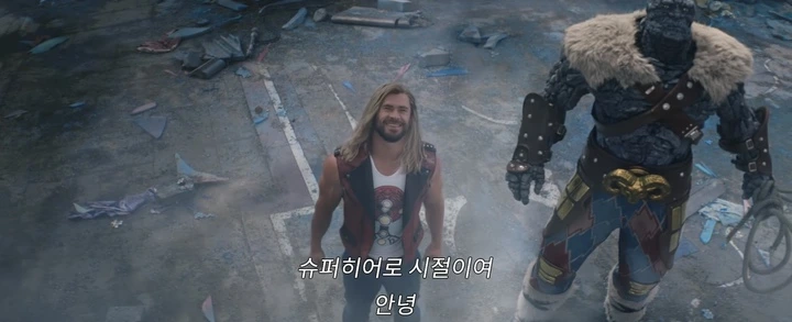 그리고 와이티티는 적어도 이런 토르의 선택을 자기 연민 없이 유쾌한 오락 영화로 풀어내는 것에는 성공했다. 나는 80년대 락밴드 포스터 같은 레트로하고 발랄한 색감과 건즈앤로지스의 기타, 어김없이 등장하는 코르그와 토르의 천진난만한 개그 같은 요소들의 오바스러움이 이야기를 풀어나가는 데 어느 정도 필요했다고 생각한다. <닥터 스트레인지: 대혼돈의 멀티버스>처럼 주인공들이 세상을 구하려는 건지 멸망시키려는 건지 헷갈리지도 않았고, 여느 히어로의 솔로 영화처럼 새로운 세계관에 대한 설명을 빚지고 있지도 않았다. 약자를 구하고 사랑을 택한, 유쾌하고 하나도 어렵지 않은, 재밌는 히어로 영화였다. 그냥 Sweet child O' mine 같은 노래와 함께 무지개 다리를 타고 사방으로 황금색 피를 튀기며 궁전을 탈출하는 것과 같은, 나를 유쾌하게 해주는 데 최선을 다하는 단순한 영화가 필요했던 것 같기도 하다.
