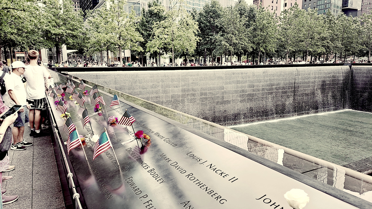 뉴욕의 world trade center에 가면 911 테러의 희생자들을 기리는 추모공원이 조성되어 있다. 쌍둥이 건물터 그대로를 살려 거대한 사각형 두 개가 땅속으로 파여있고 벽면을 따라 흐르는 물이 가운데의 또 다른 사각형 안으로 흘러들어 간다. 사각형의 난간에는 희생자들의 이름이 조각되어 있고 군데군데 넋을 기리는 조화나 메모, 성조기들이 꽂혀있다.