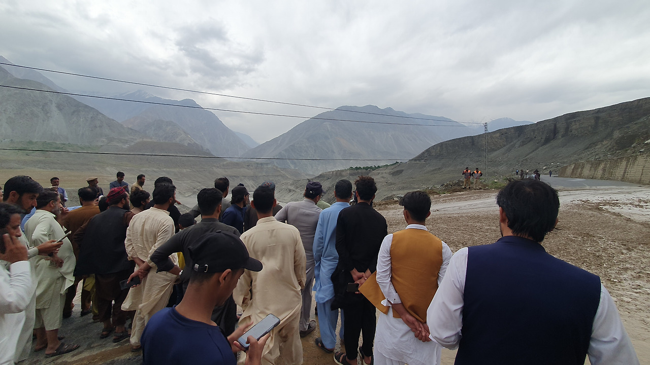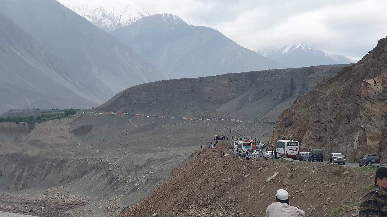 8. 다행히 차량의 피해 없이 산사태는 멈췄다. 그리고 도로의 흐름도 멈췄다. 산사태의 잔해를 치우고, 반대편 차량과 교대로 그곳을 빠져나오기까지 4시간 동안 도로에 갇혀 있었다. '훈자'에서 빙하가 녹은 장수의 상징 ‘훈자 워터’를 마셔 걸린 장염으로 이동 중엔 아무것도 먹지 않는 고행을 하고 있는데, 4시간은 너무 길다. 하지만 다행히 갇혀 있는 이곳 경치가 끝내주긴 하다. 같은 버스를 탄 파키스탄 군인 청년이 저기 보이는 산이 바로 '낭가파르바트'라 알려준다. 육안으로 '낭가파르바트'도 보고... 이건 완전 러키비키잖아!