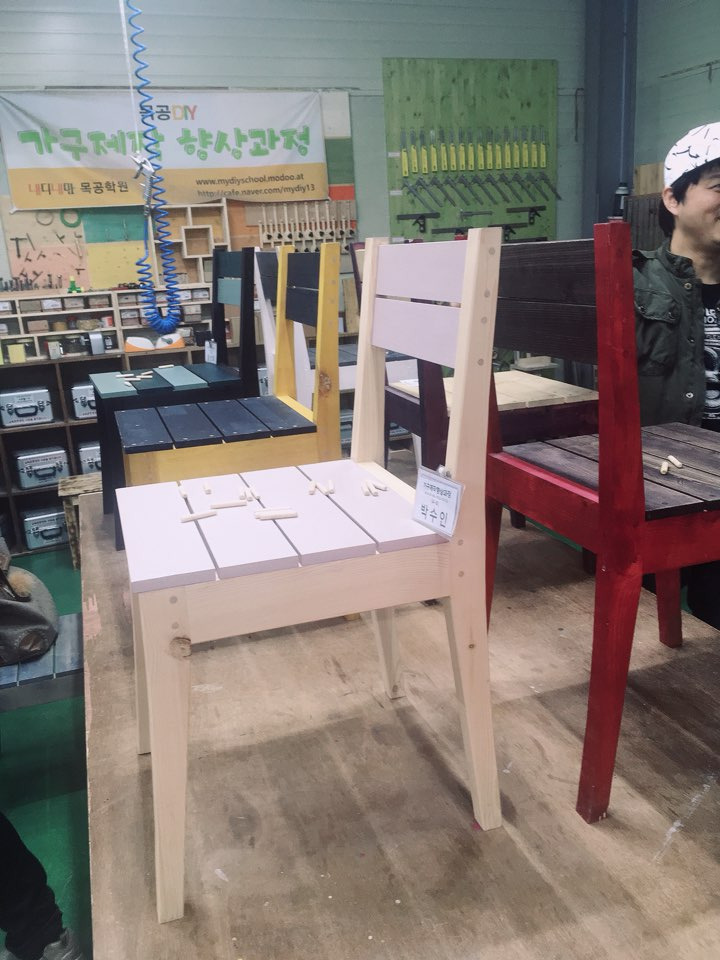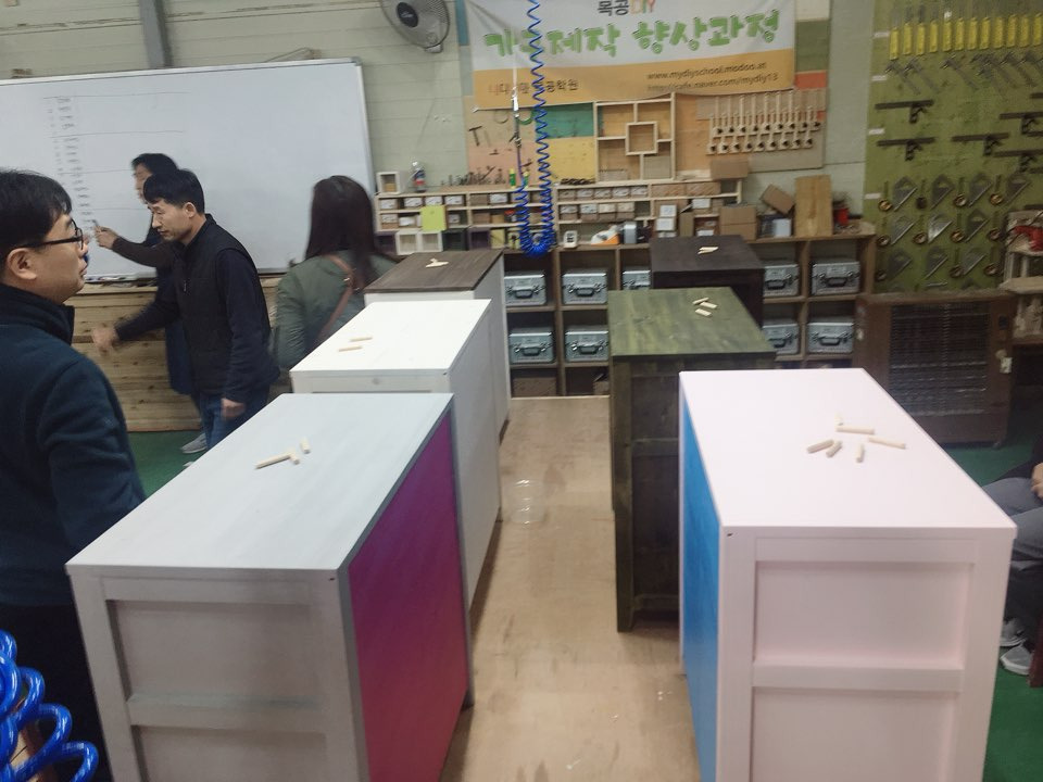 강의는 어느덧 마지막 주가 되고, 수강생들이 만든 작품들을 수강생끼리 투표하는 시간도 가졌다. 미니장, 서랍장, 벤치, 의자 지금까지 만든 작품들이 차례로 전시되었다. 투표는 목심이라고 하는 짧고 얇은 나무막대를 마음에 드는 작품 위에 올려 놓는 것으로 진행되었다. 목심 갯수가 가장 많은 작품이 1등이다. 조원분들이 도와준 서랍장 위에는 4개의 목심이 놓였다. 건너편 목심은 그보다 많다. 그래도 로다는 잘한 편이었다.