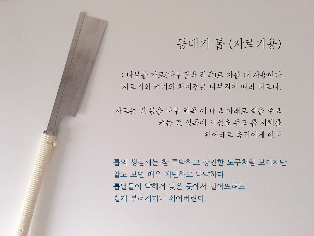 다른 직업도 그러하겠지만 목수는 특히 도구를 다루는 일까지 포함한다. 재료(나무)는 물론 재료를 다스리는 도구(대패, 망치 등)들도 직접 손보기 때문이다. 바리스타가 원두를 볶는 것은 물론 원두 볶는 도구까지 손볼 줄 알아야 하는 느낌이랄까.