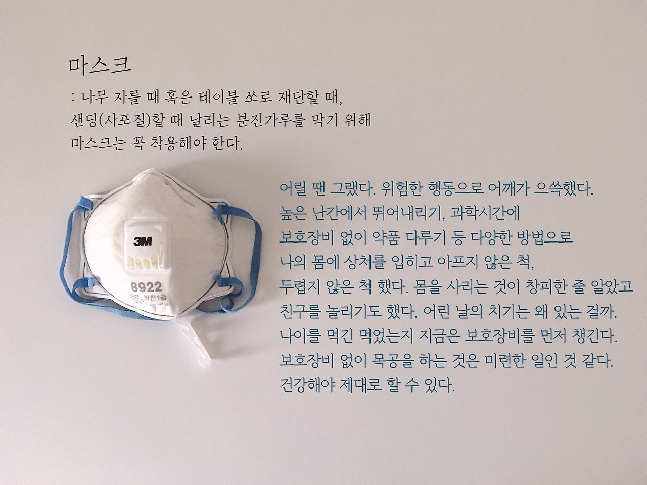 나이를 먹긴 먹었나보다 지금은 마스크가 필수다. 보호장비 없이 목공을 하는 것은 미련한 일인 것 같다. 건강해야 제대로 할 수 있다.