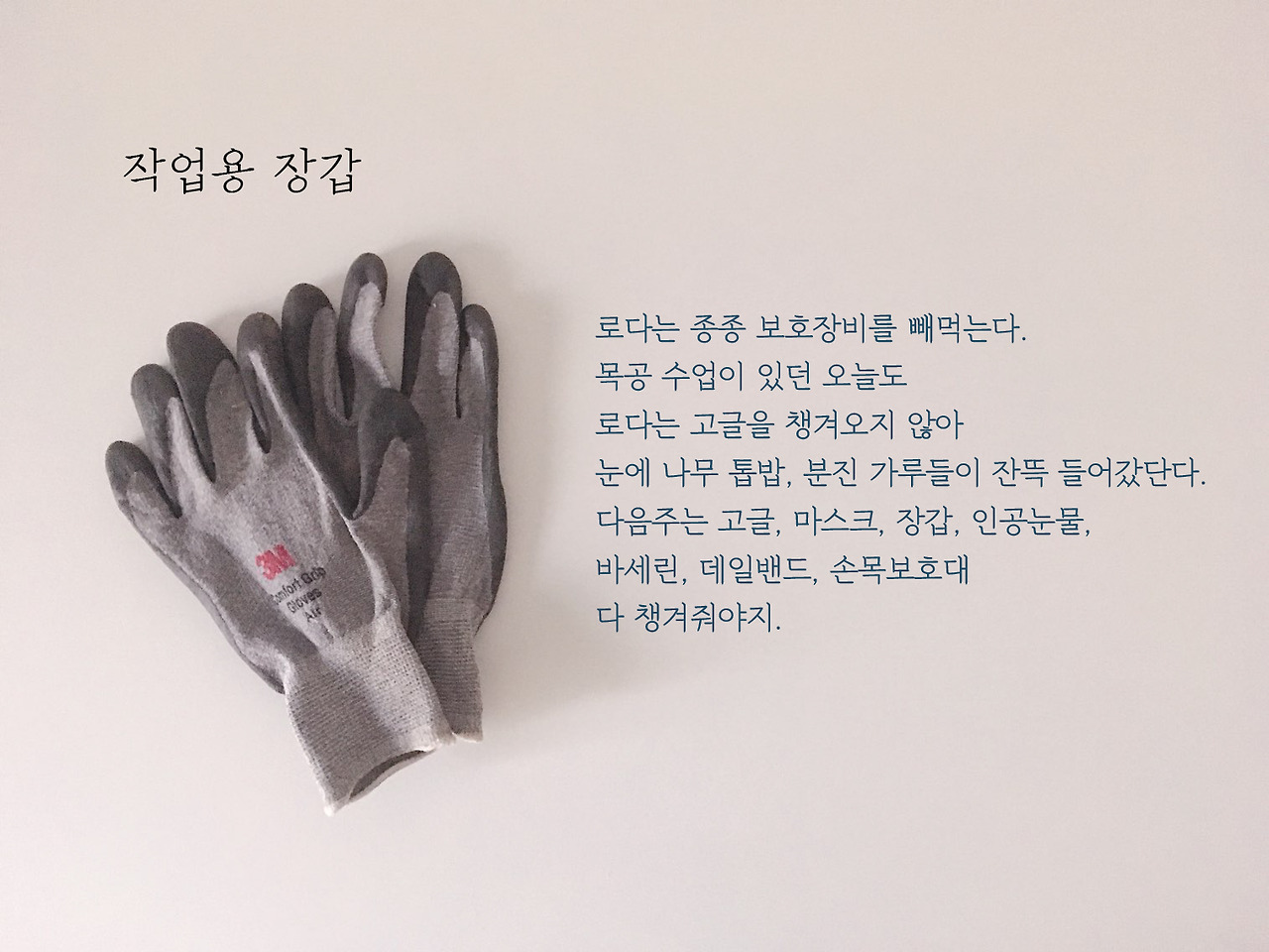 로다는 종종 보호장비를 빼먹는다. 목공 수업이 있던 오늘도 로다는 고글을 챙겨오지 않아 눈에 나무 톱밥, 분진 가루들이 잔뜩 들어갔단다. 다음주는 고글, 마스크, 장갑, 인공눈물,바세린, 대일밴드, 손목보호대 다 챙겨줘야지.