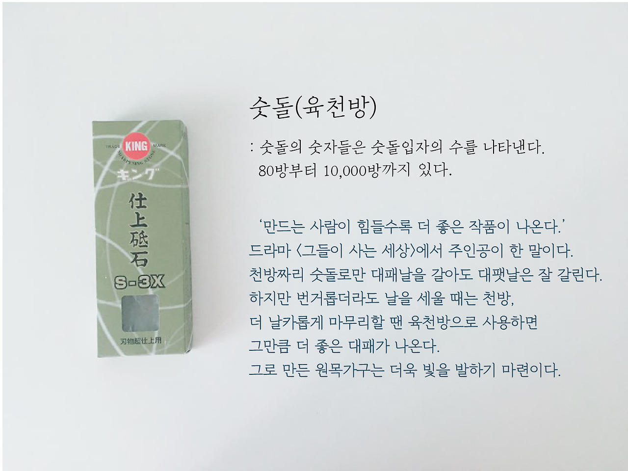 숫돌_천방: 물에 담근 후 대팻날이나 끌날을 갈 때 사용한다. 숫자가 클수록 부드럽다 천(1,000)방으로 날을 세우고 육천(6,000)방으로 마무리한다.