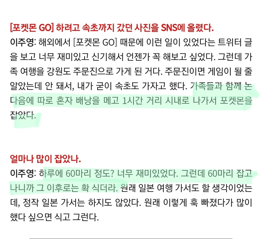 1. <야구소녀>, <이태원 클라쓰>, <메기>에서 열연한 배우 이주영 님은 고등학생 시절 체대 입시를 준비했었다고 합니다. 이유는 야자하기 싫어서. 2. 스포츠를 시작한 이유는 공부가 싫어서였지만, 스포츠를 계속한 이유는 성취감 때문이었는데요. 실력이 늘어나는 게 눈으로 보이는 점에 빠진 것입니다. 성장할 때마다 피드백과 보상을 주는 게임과 구조가 비슷하죠. 해도해도 채찍질만 받는 공부랑은 다르고요. 3. 2016년, 이주영 님은 실제로도 게임에 푹 빠졌습니다. 포켓몬GO를 플레이하기 위해 가족여행 동선을 바꿔가며 혼자 속초로 향할 정도로요. 그리고 하루에 60여마리의 포켓몬을 잡았다네요.