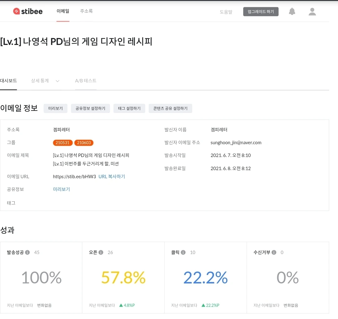 뉴스레터 두 번째 메일을 보냈다. 오픈율 55%