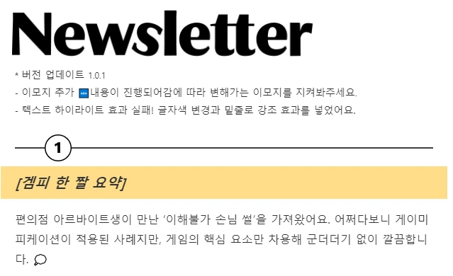 5. 관련해서 이번에는 업데이트 노트를 레터 첫머리에 기록했습니다. 앱 업데이트하면 개발자가 쓰는 그것처럼요(ex. YouTube가 오전 반차를 썼댄다, 어쩌겠니 어우 증말). 첫 레터에서 가장 많은 피드백을 받았던 시각자료(짤)를 삽입했습니다. 같이 만들어간다는 감각을 느꼈으면 하는데, 희미하게나마 느끼셨을까요?
