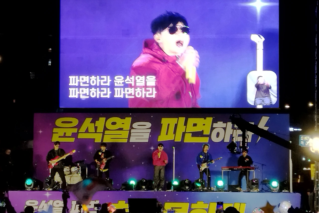 집회의 분위기는 뜨거웠고 날씨는 차가웠다. 왜 우리가 모이면 날은 이토록 차가워지는 것인지. 그런 와중에도 거리에 모여 앉아 '탄핵'과 '파면'을 외치는 사람들의 모습을 보며 대체 언제까지 시민들이 이 고된 여정을 계속해야 하는 걸까 생각하는 사이에 집회는 계속 진행이 되었고, 마침내 그가 무대에 올랐다. 자신의 공연을 취소하고 나이를 들먹이며 주제넘은 훈계를 했던 꼰대 구미시장보다 네 살이 많은 이승환의 모습은 여전히 어린왕자였다. 네 곡의 노래를 부르며 사람들을 열광시키고 내려간 뒤 앵콜 요청으로 다시 올라와 부른 곡은 바로 '덩크슛'이었다.