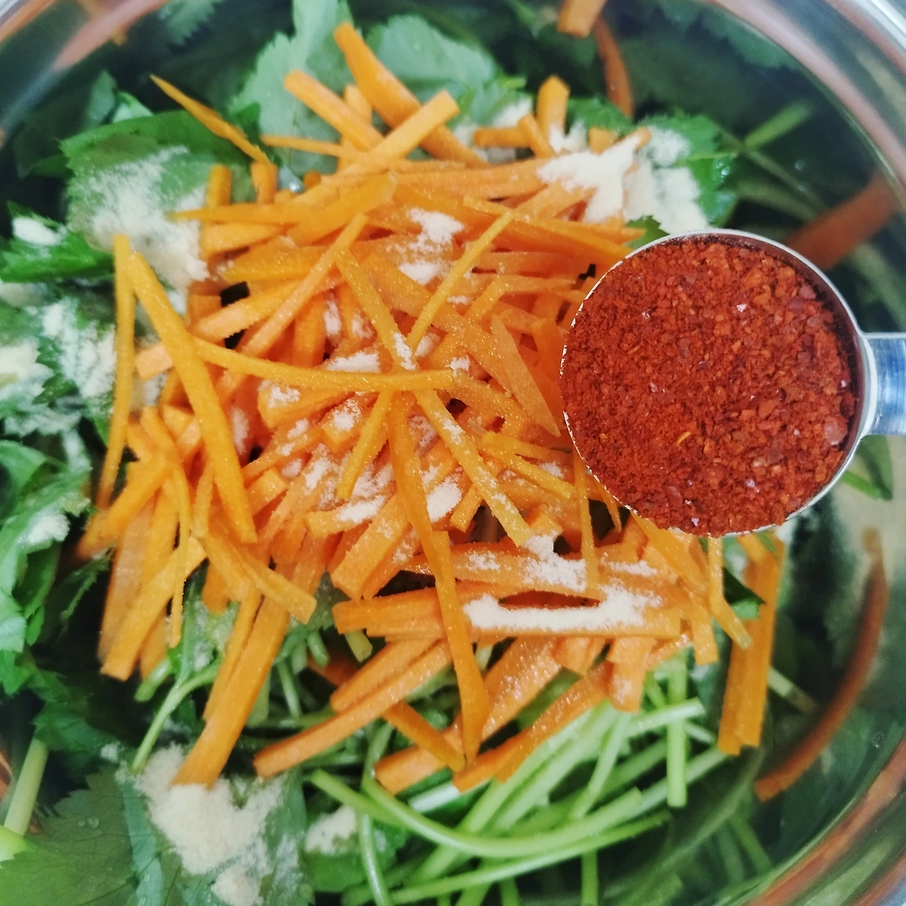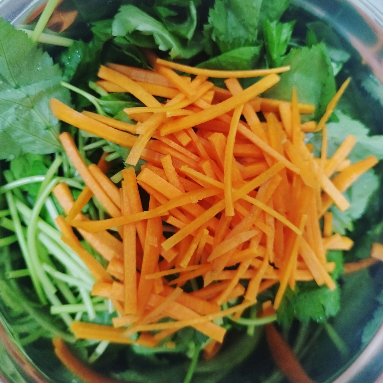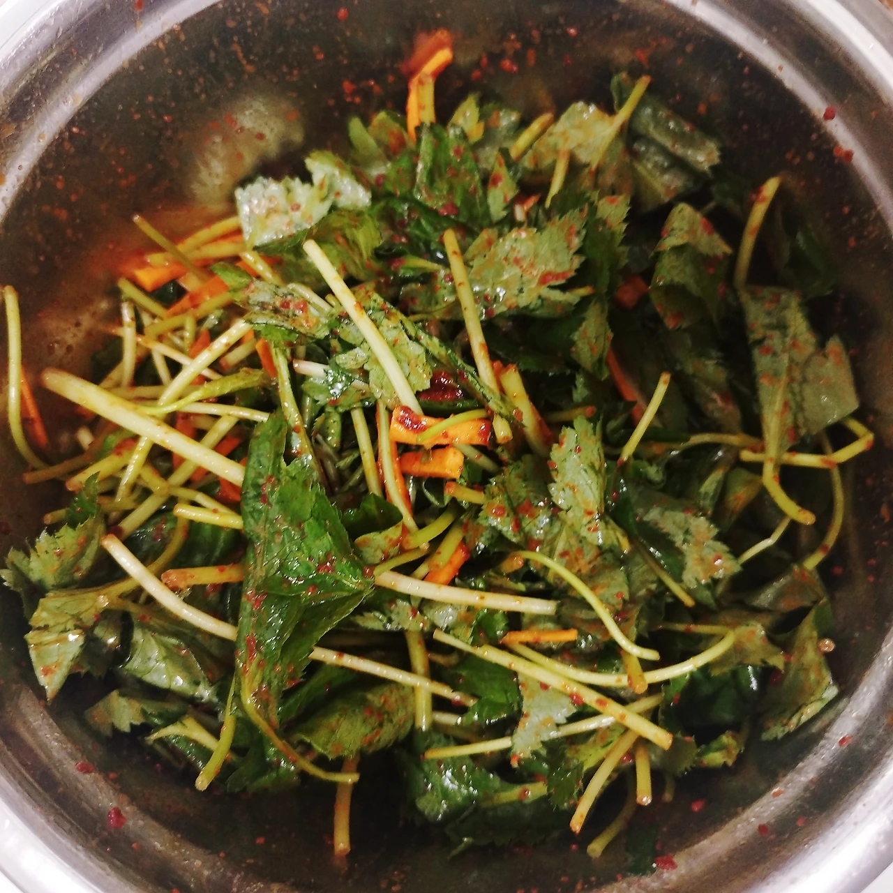 참나물무침은 레시피라고 하기엔 민망할 정도로 만들기가 쉽다. 참나물 줄기의 지저분한 곳을 떼어내고 나물을 씻은 뒤 적당한 크기로 자른다. 참나물만 들어가면 심심하니 당근을 채 썰어 넣으면 식감도, 색감도 모두 좋아진다. 거기에 양념으로 설탕과 고춧가루, 식초와 참기름을 넣고 간은 멸치액젓으로 맞춘다. 양념을 다 넣은 뒤 나물을 꽉 쥐지 말고 조심스레 조물조물 버무리면 그걸로 완성되는 아주 간단한 메뉴다. 그런데 이렇게 간단하고 재료도 간소함에도 먹을 때의 만족감이 큰 것을 보면 가성비가 엄청난 메뉴이기도 한 셈이다.