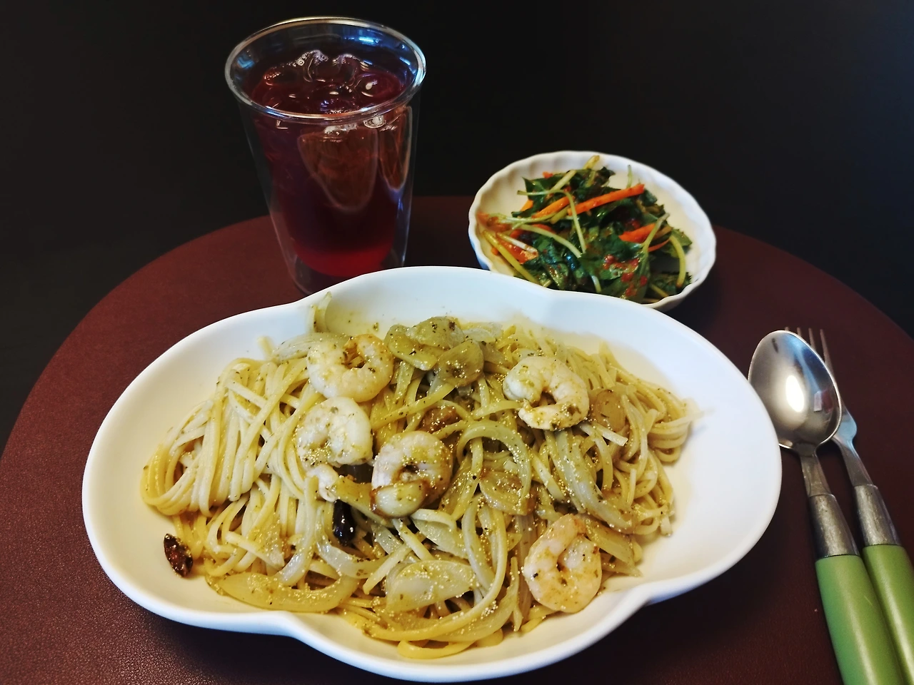 그렇게 하여 오늘의 메뉴는 참나물무침과 오미자에이드를 곁들인 명란바질파스타가 되었다. 파스타를 한입 잔뜩 먹고 나니 올리브유의 기름기가 입 안을 가득 채운다. 그러고 나서 입에 넣은 참나물무침은 파스타의 기름진 맛을 혀에서 중화시키고, 아주 상큼한 식감을 가져다주며 다시 파스타를 먹고 싶게 만들어주었다. 그래서인지 오늘도 면 조절에 실패해 파스타의 양이 꽤 많았음에도 전혀 느끼함 없이 한 접시를 뚝딱 비워냈다. 어쩌면 피클보다는 나물무침이 파스타와 더 궁합이 좋은 것이 아닐까. 파스타에 무엇을 곁들여먹을지 고민인 분이 있으시다면, 조심스레 이 조합... 추천드려 본다.