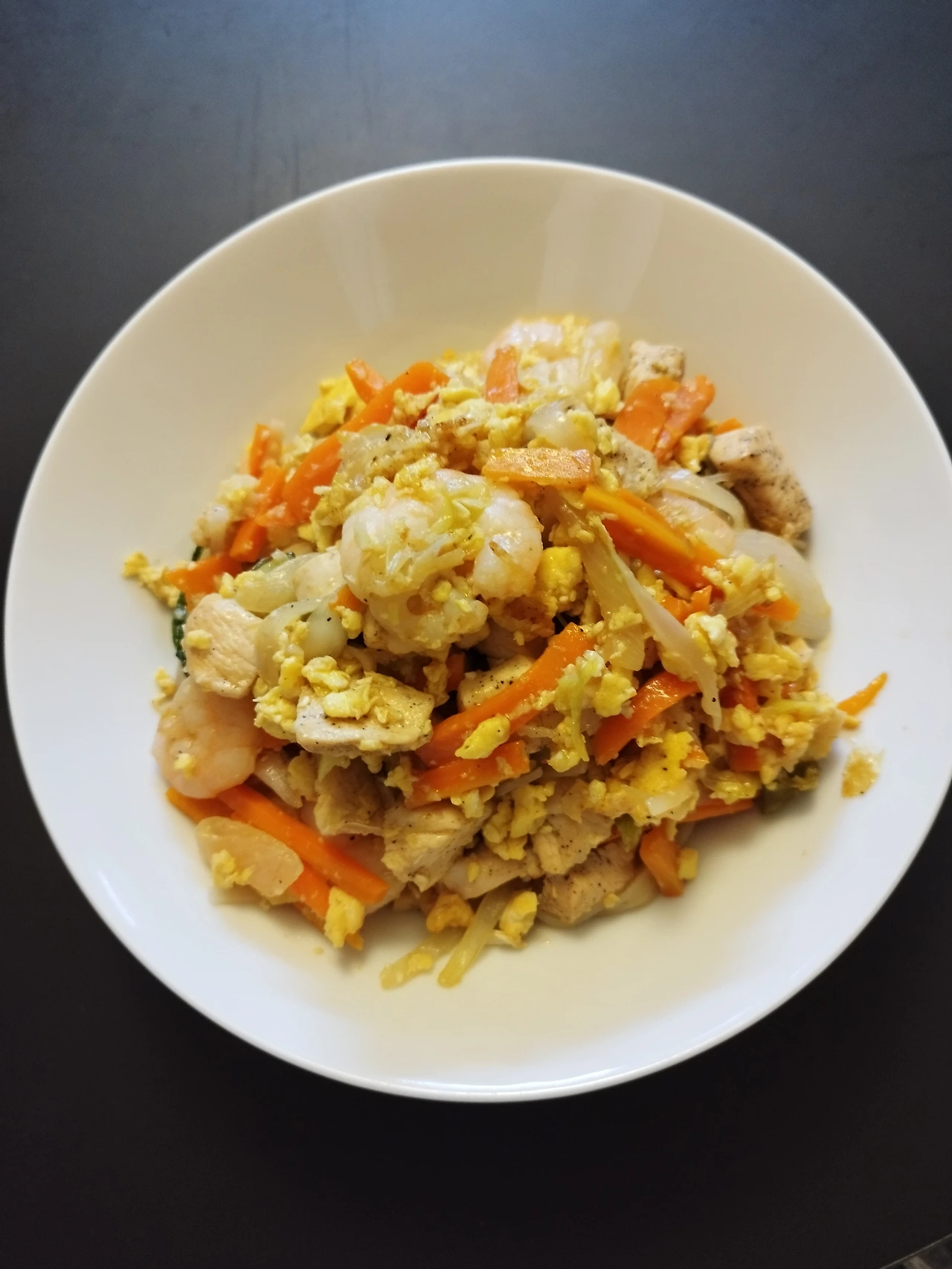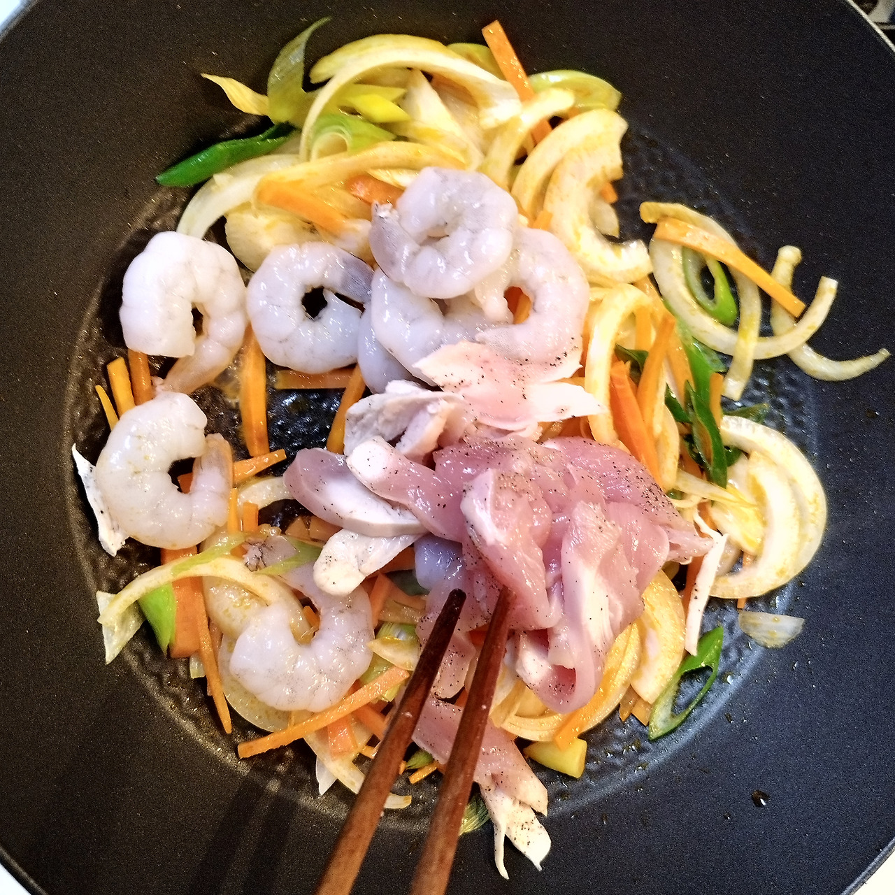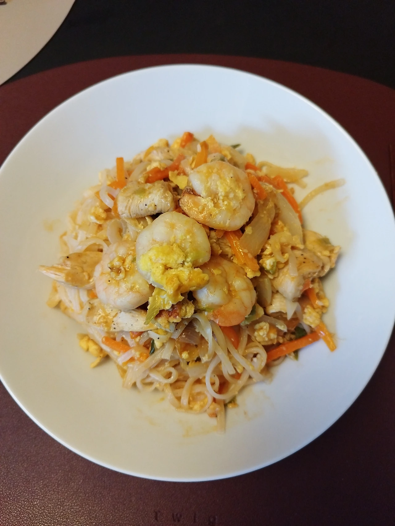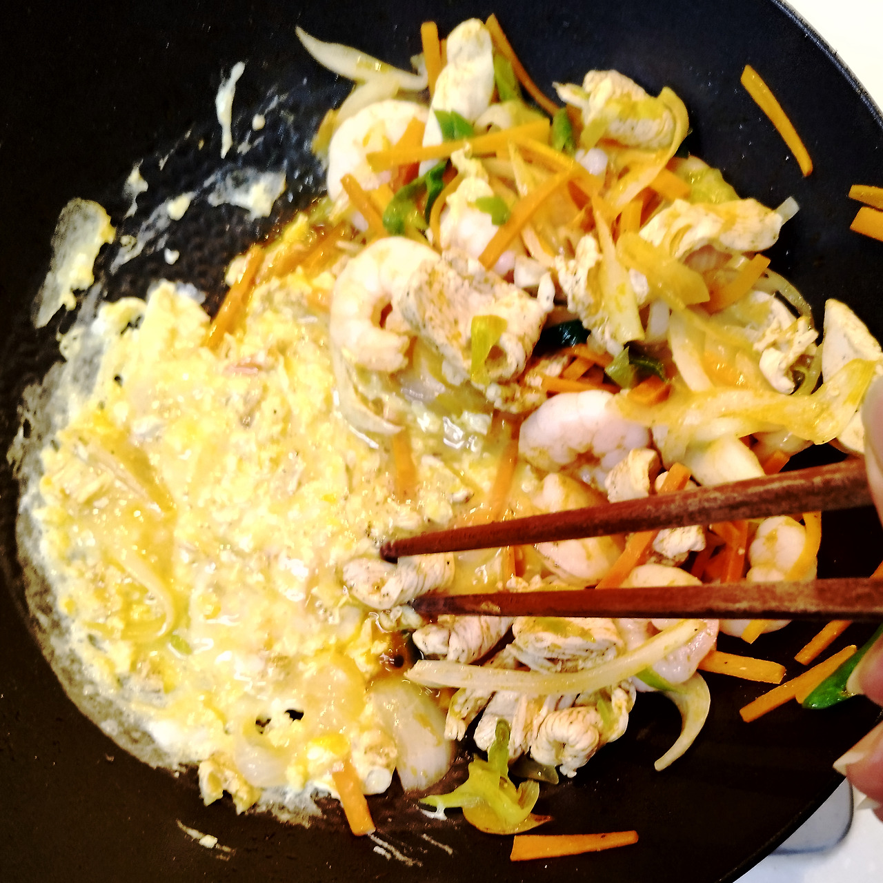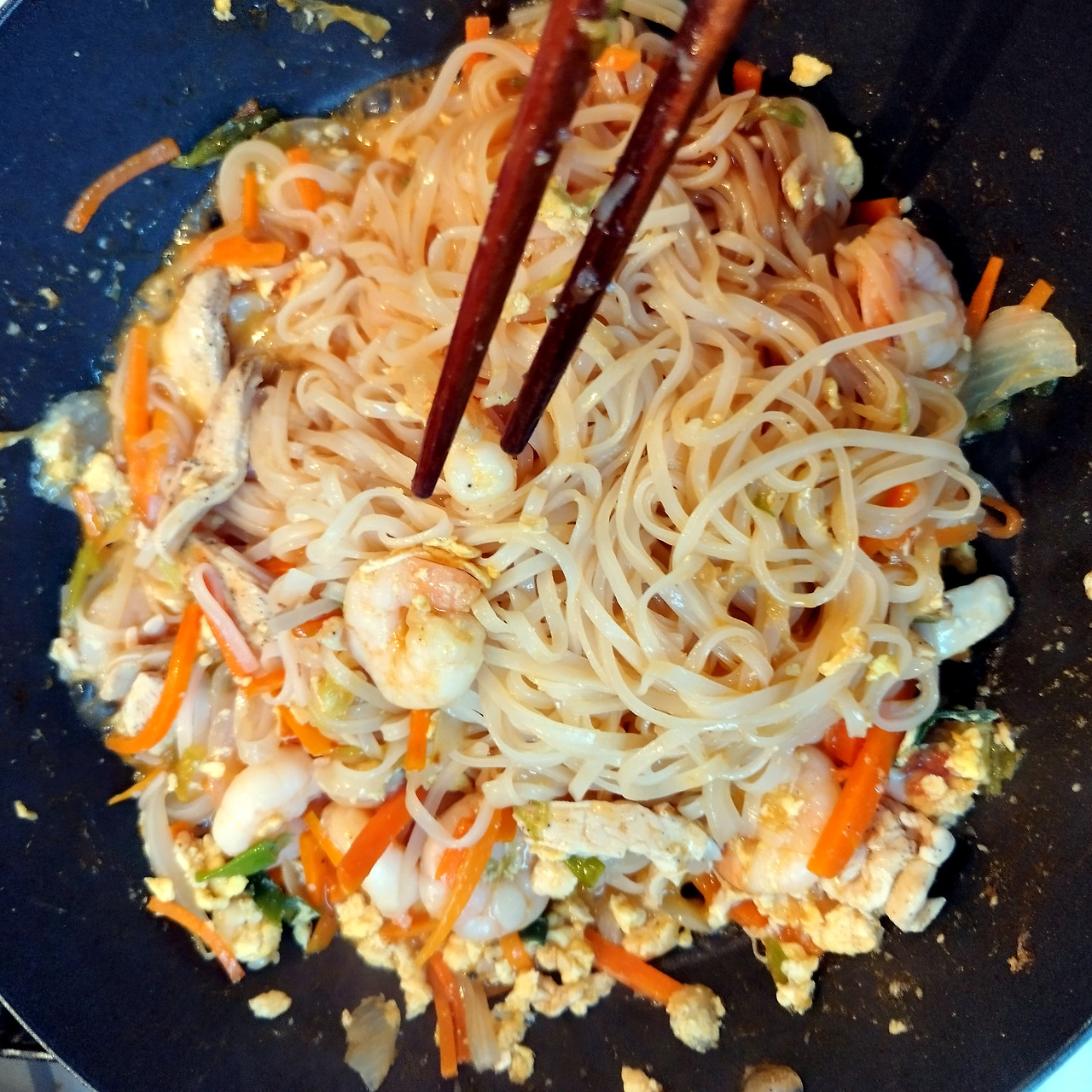 과정은 늘 간단하다. 재료를 손질하여 준비하고 기름에 야채를 볶다가 새우, 닭가슴살을 넣고 계속 볶고, 재료들을 한쪽에 몰아넣은 뒤 남은 공간에 계란으로 스크램블을 만들고 면을 넣어 볶으면 된다. 참 쉽죠?(참고로 쌀국수면은 생각보다 많이 넣어야 한다. 태국사람들의 4인분과 우리나라 사람들의 4인분은 많이 다르더라)