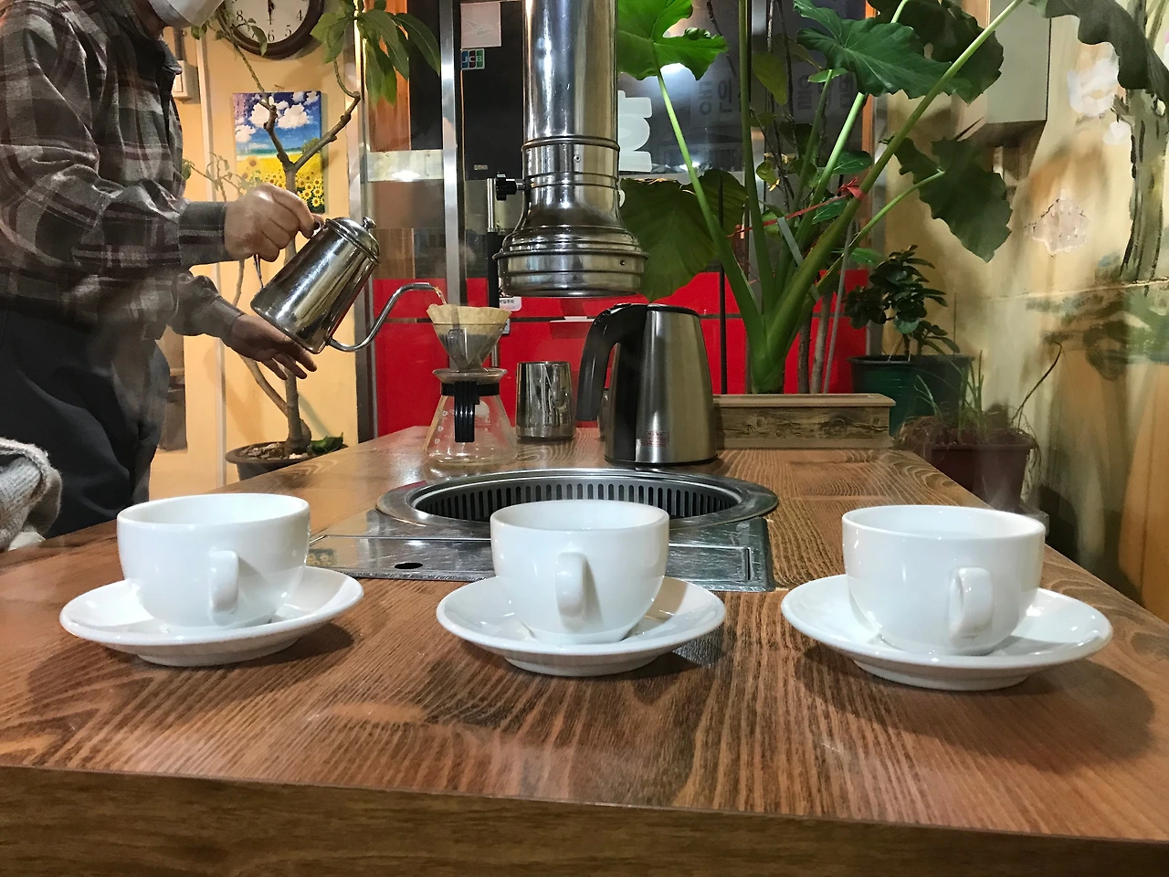 첫 모임으로 홍예문 올라가는 길에 있는 숯불구이 집을 찾았다. 평범한 고깃집으로 보였으나 그게 아니라는 걸 곧 알게 되었다. 식사가 끝나자 마법이 펼쳐진다. 시의적절한 서빙과 호텔급 매너를 보여주시던 사장님이 바리스타로 변신한다. 화로구이 테이블에 커피세트가 펼쳐지고 사려깊은 핸드드립과 애드립이 이어진다. 그냥 하는 게 아니라 모든 게 제대로다. 오! 맛도 일품. 사장님 표정을 보니 고기 구울 때와는 사뭇 다르다. 그는 행복하다.