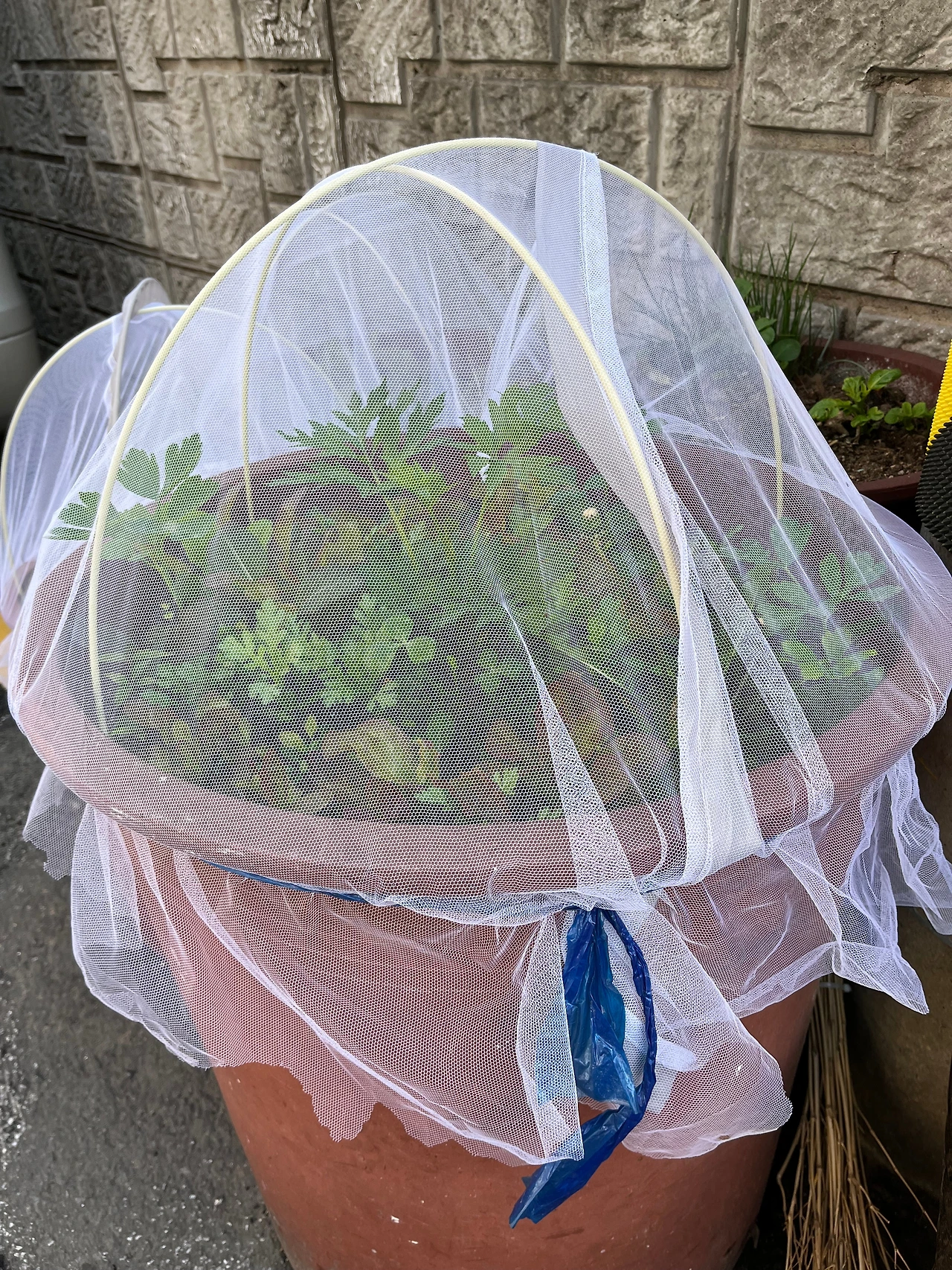 사는 집은 모시나 비단으로 수를 놓고 급할 땐 신문지로 대신하기도 했던 그 밥상보. 화분을 덮은 건 그 밥상보를 닮았다. 그런데 화분 텃밭을 덮었으니 ‘텃밭보’나 ‘화분보’라고 해야 맞을까. 어떻게 화분을 통째로 이렇게 덮을 생각을 다 했을까.