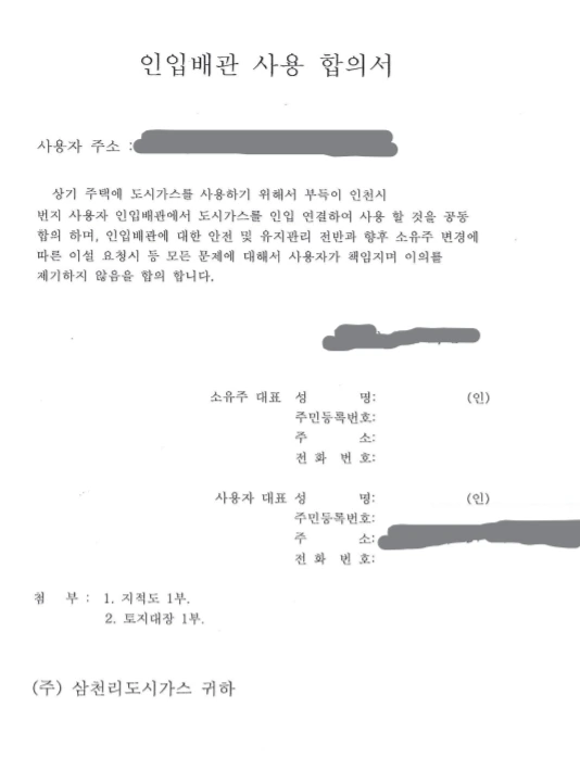 2. '인입배관사용합의서'를 받아야 합니다. 그래야 설치비가 덜 듭니다. 간혹 합의를 안 해주는 이웃도 있다고 합니다. 열과 성을 다해 읍소해야 합니다.