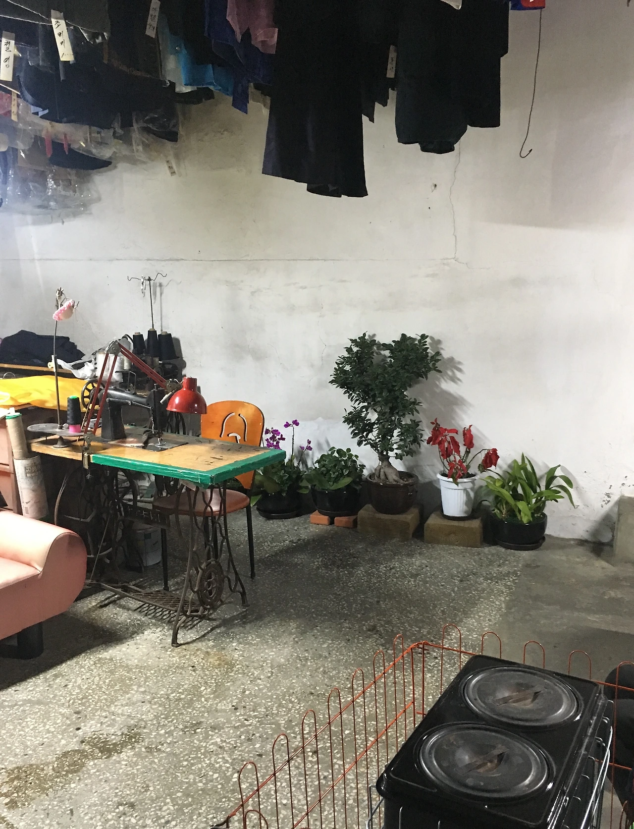 그때부터 이어지는 인플루엔서 특유의 친화력과 붙임성에 나도 모르게 그새 아주머니를 팔로우하고 하트까지 여러 번 누를 뻔했다. 아주머니는 처음 보는 사람의 직업과 나이, 고향, 가족관계 그리고 취향까지 모두 술술 불게 만드는 놀라운 말솜씨를 갖고 계셨다. 나도 마냥 서서 취조를 당하는 게 싫지 않았던 것이, 은은한 비취색 타일 때문에 유니크하게 보인던 세탁소 건물 내부는 더 유니크했기 때문이었다. 구조도 특이해서 천장이 높고 깊었다. 그 높은 천장에 옷들이 대롱대롱 걸려있었다. 게다가 아마도 족히 50년은 돼 보이는 재봉틀과 갖가지 집기들이 내 눈을 사로잡고 있었다.