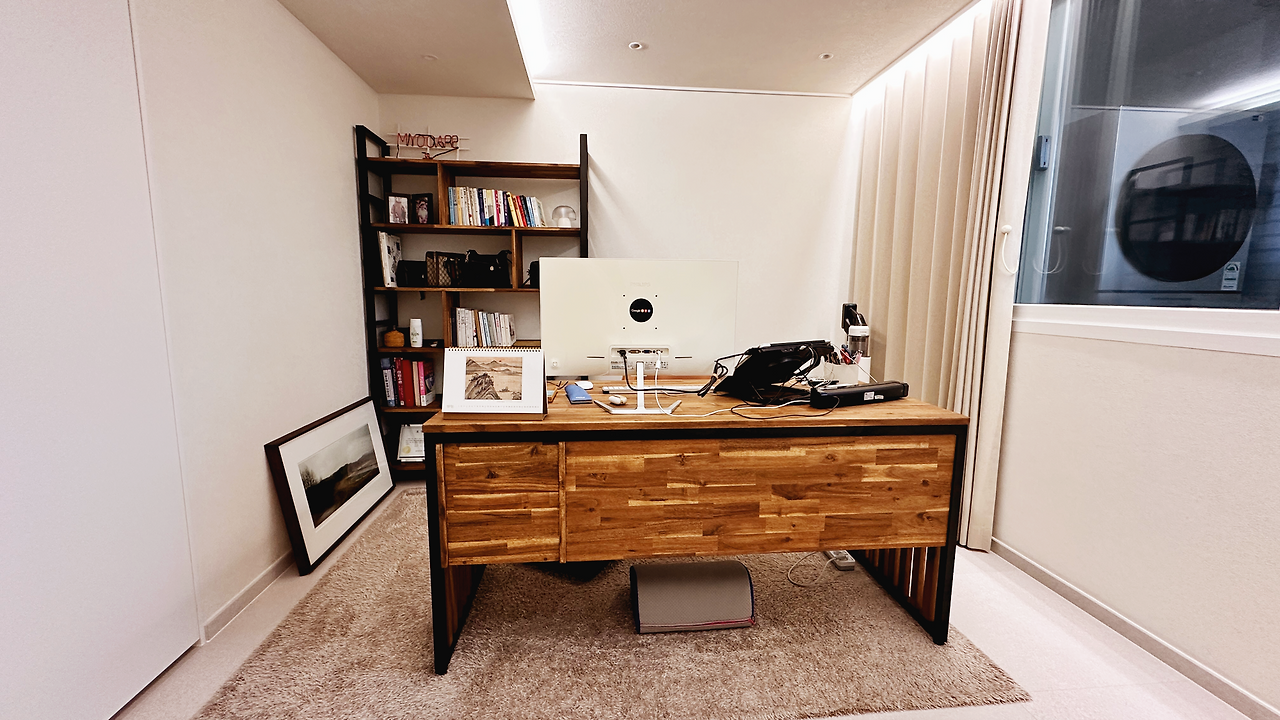 이중창 중 한쪽을 크게 내 개방감을 높였고, 시야에는 풍경이 들어옵니다. 홍대 디자인에서 맞춘 원목 책상과 책장, 이케아의 사무용 의자. 그리고 쉬는 시간을 위한 안마기 하나.