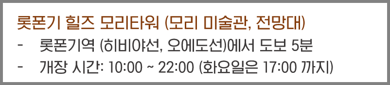 도쿄 여행을 준비할 때도 인스타그램에서 전망대를 가장 먼저 찾아보았다. 도쿄타워와 스카이트리의 사진도 많았지만, 유독 롯폰기 힐즈의 사진에서는 야경과 함께 예술 작품들도 함께 등장했다. 검색을 해보니 롯폰기 힐즈 전망대에는 ‘모리 미술관’이 함께 있었고, 티켓 역시 전망대와 미술관을 패키지로 판매하고 있었다. 전시와 야경이라는 신선한 조합에 망설임 없이 예매 버튼을 눌러버렸다. (롯폰기 힐즈에서 도쿄 타워가 가장 잘 보인다는 이점도 있다. 바로 옆에 있는 돈카츠 맛집 ‘부타구미’는 덤)