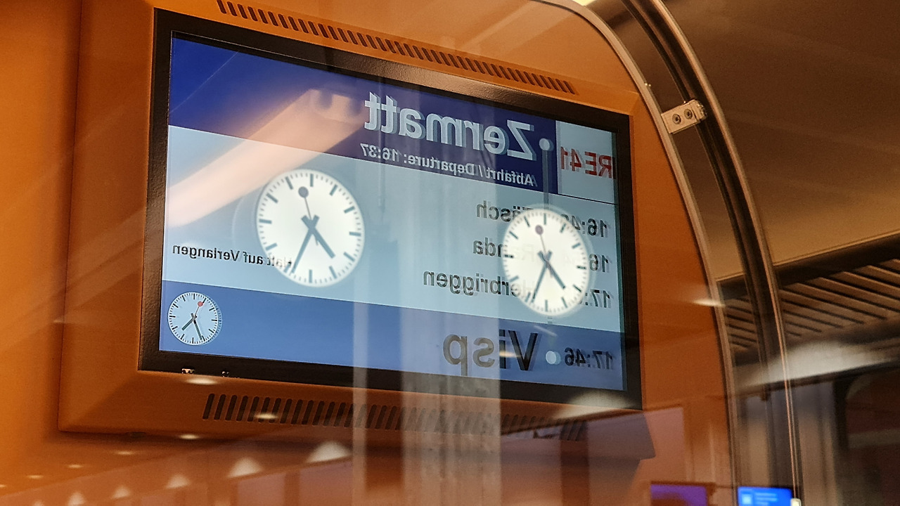 벽시계 두 개가 한 쌍인데, 초침 하나까지 0.1초의 오차도 없이 똑같이 시계바늘이 회전한다. 정확히 일치하는 초침 두 개를 멍하니 쳐다보고 있자니 정확한 동작으로 왈츠를 추고있는 무희같은 느낌도 들고 묘한 쾌감까지 느껴진다. 넋 놓고 있다가 기차 탑승 후에야 부랴부랴 사진을 찍었는데, 열차 내 안내된 전광판 스크린의 디지털 시계 문양 역시 "스위스 기차역 시계"와 디자인이 완전히 동일하며, 저 두 아날로그 시계와는 딱 "1초"의 시간차만 보이고 있다.