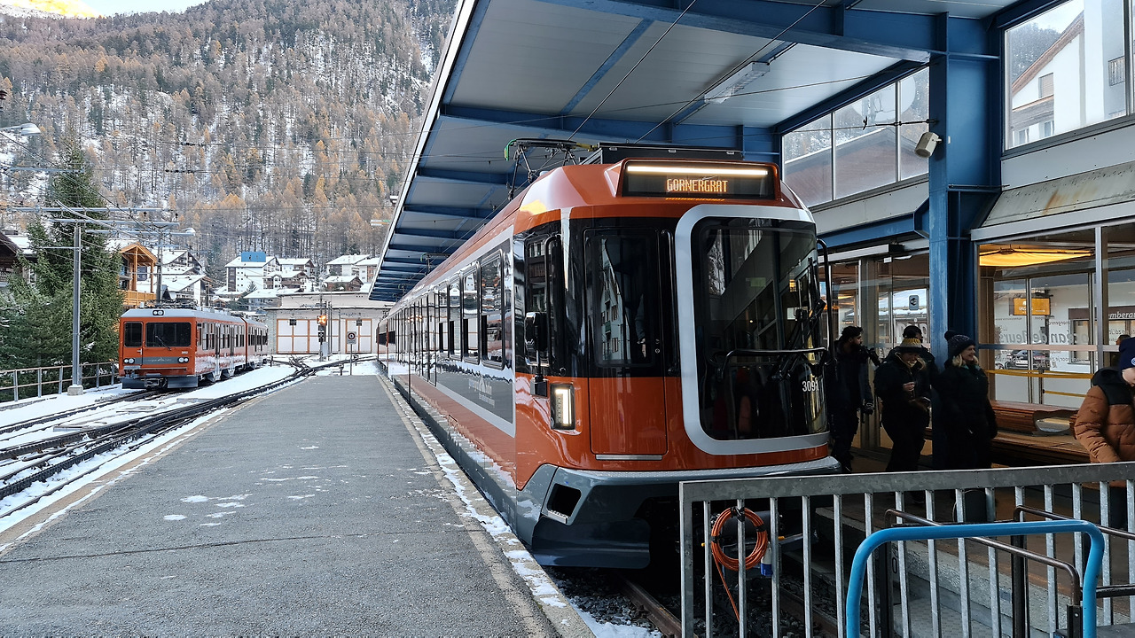고르너그라트 행 산악열차 전경. 자세히 보면 가운데 철로가 톱니 모양이다.